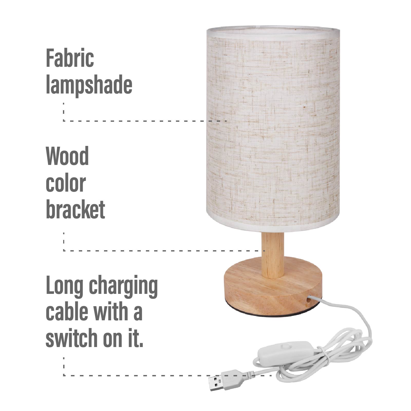 The elegant, stylish look of this table lamp enhances the beauty of your home, with an open top cloth cover in beige linen hovering over a small solid wood base.