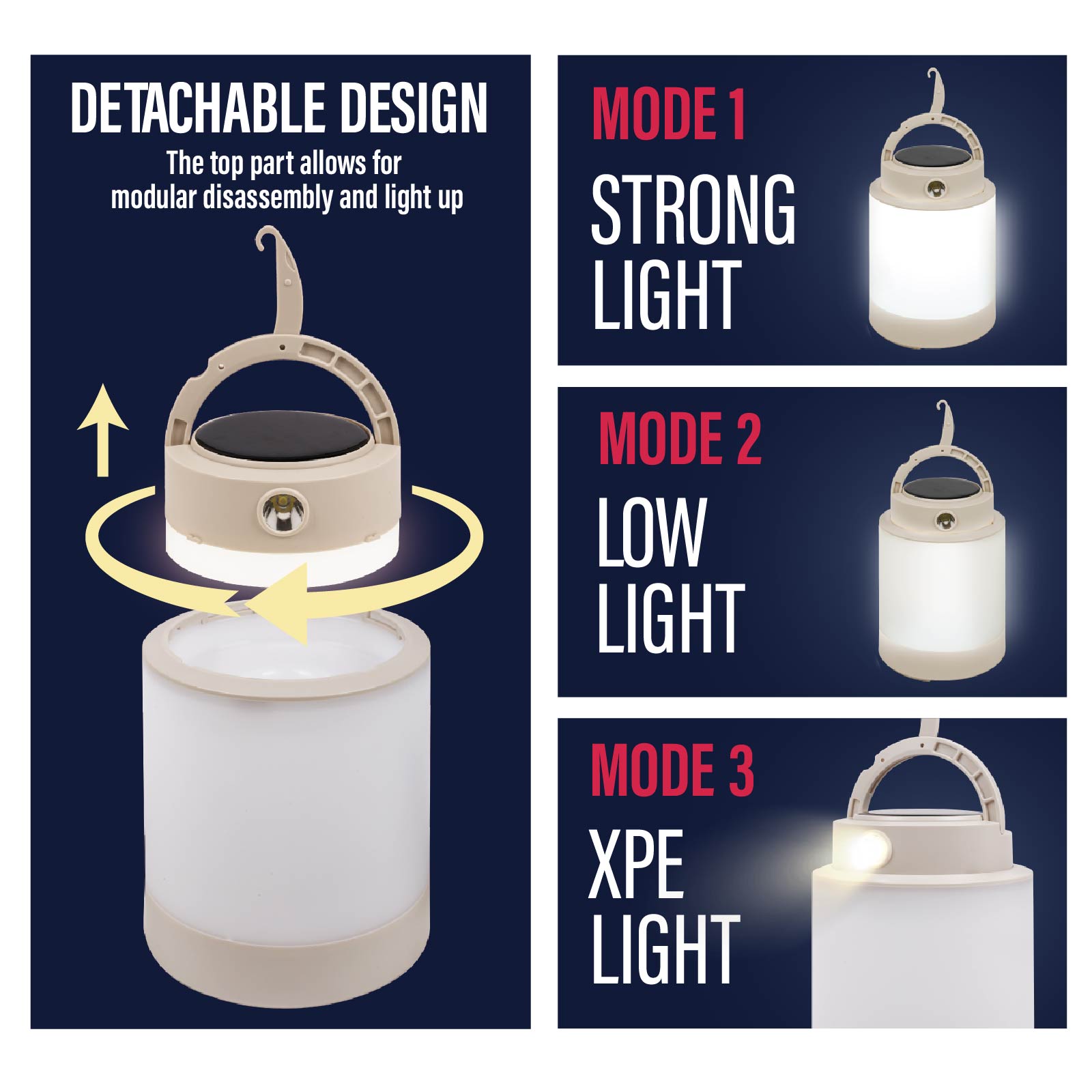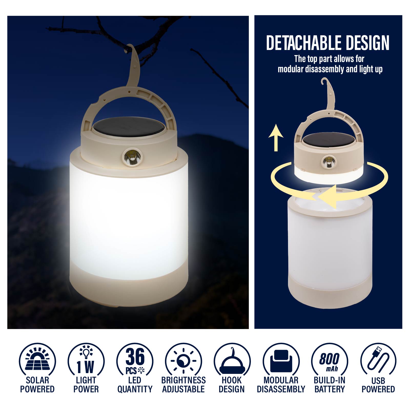 - Function : Detachable Design, Adjustable Brightness, Hook Design, Built-in Rechargeable Battery, USB powered, Solar Powered.