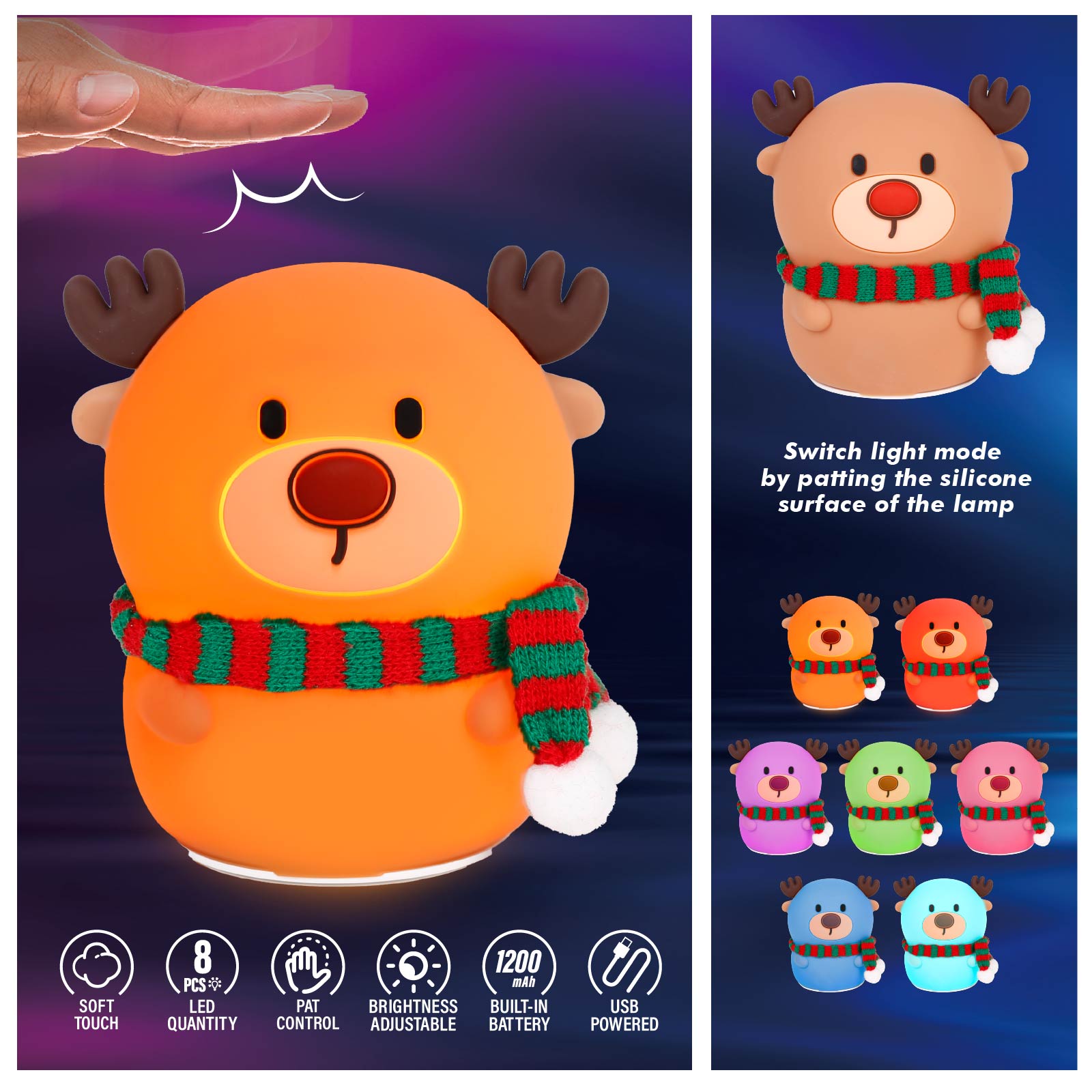 LG03-347Super cute night light, soothing glow creates a relaxing bedtime experience which can protect your kids from darkness and help them fall asleep. You can change its light color by patting the silicone surface.