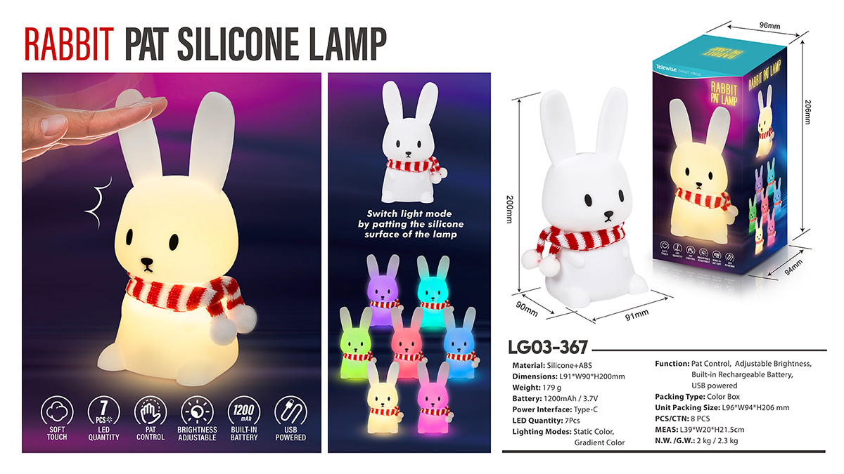 LG03-367Super cute night light, soothing glow creates a relaxing bedtime experience which can protect your kids from darkness and help them fall asleep. 7-color breathing mode and single color mode. You can change its mode by patting the silicone surface.
