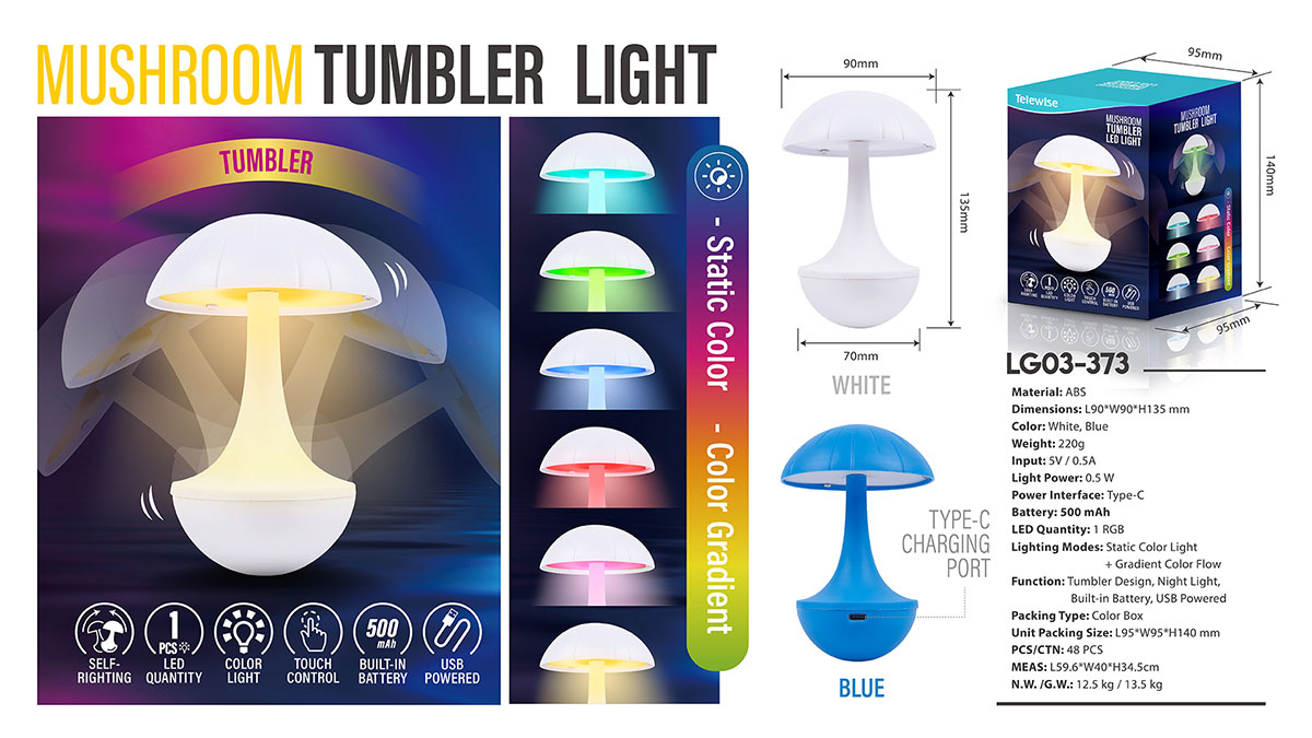 LG03-373Wobble, glow, repeat. Our mushroom nightlight changes colors at your touch,bedtime should be bright and playful