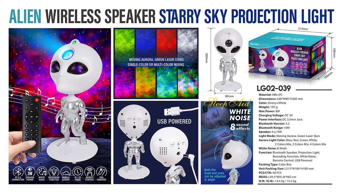 LG02-039Embark on an interstellar audio adventure with our innovative Alien Bluetooth Speaker featuring a mesmerizing starry sky projection light. This isn't just a speaker; it's a portal to the cosmos, right in the comfort of your room.