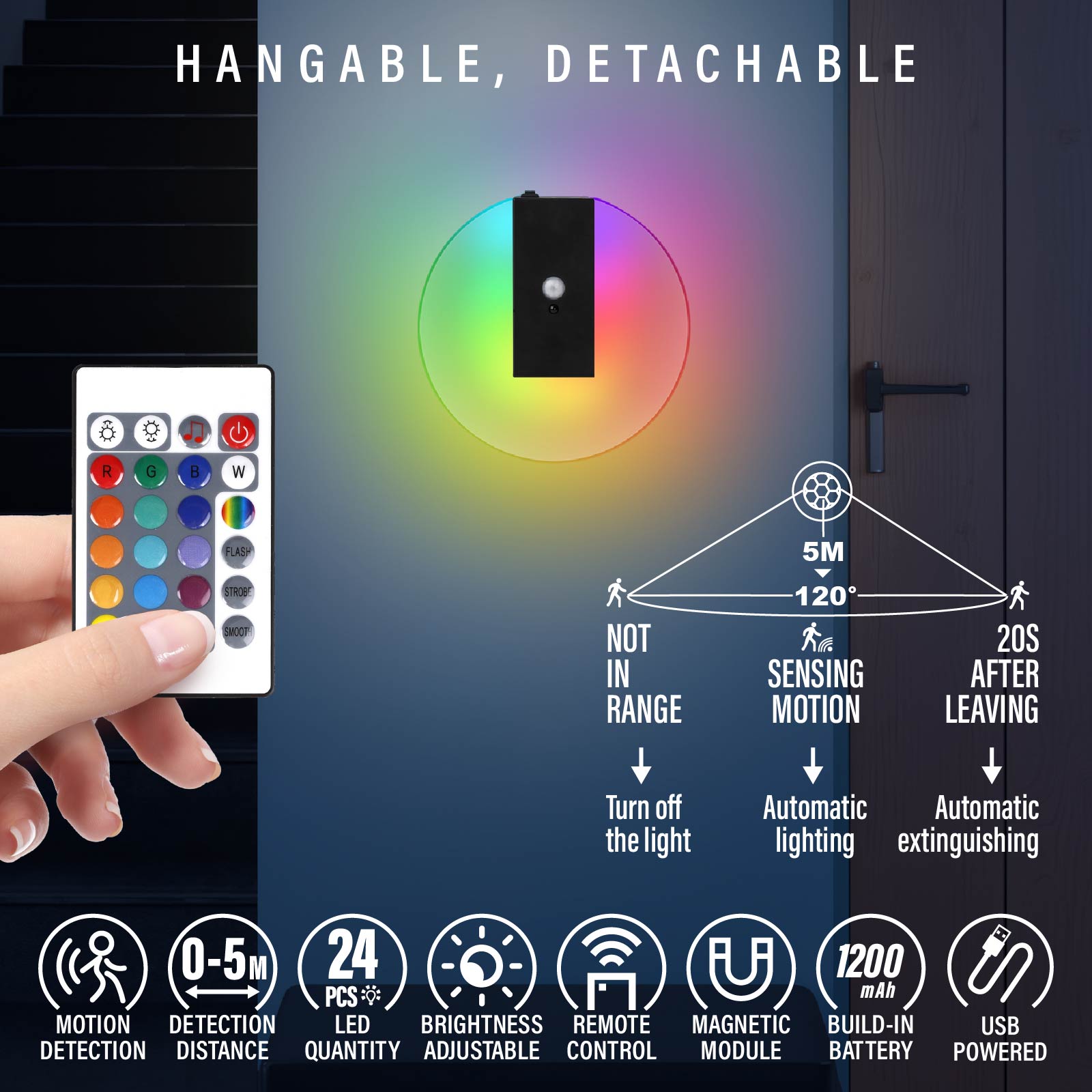 - Function : Motion Sensor, Light Mode Adjustable, Remote Control, Detachable Magnetic Module, Built-in Rechargeable Battery, USB Powered.