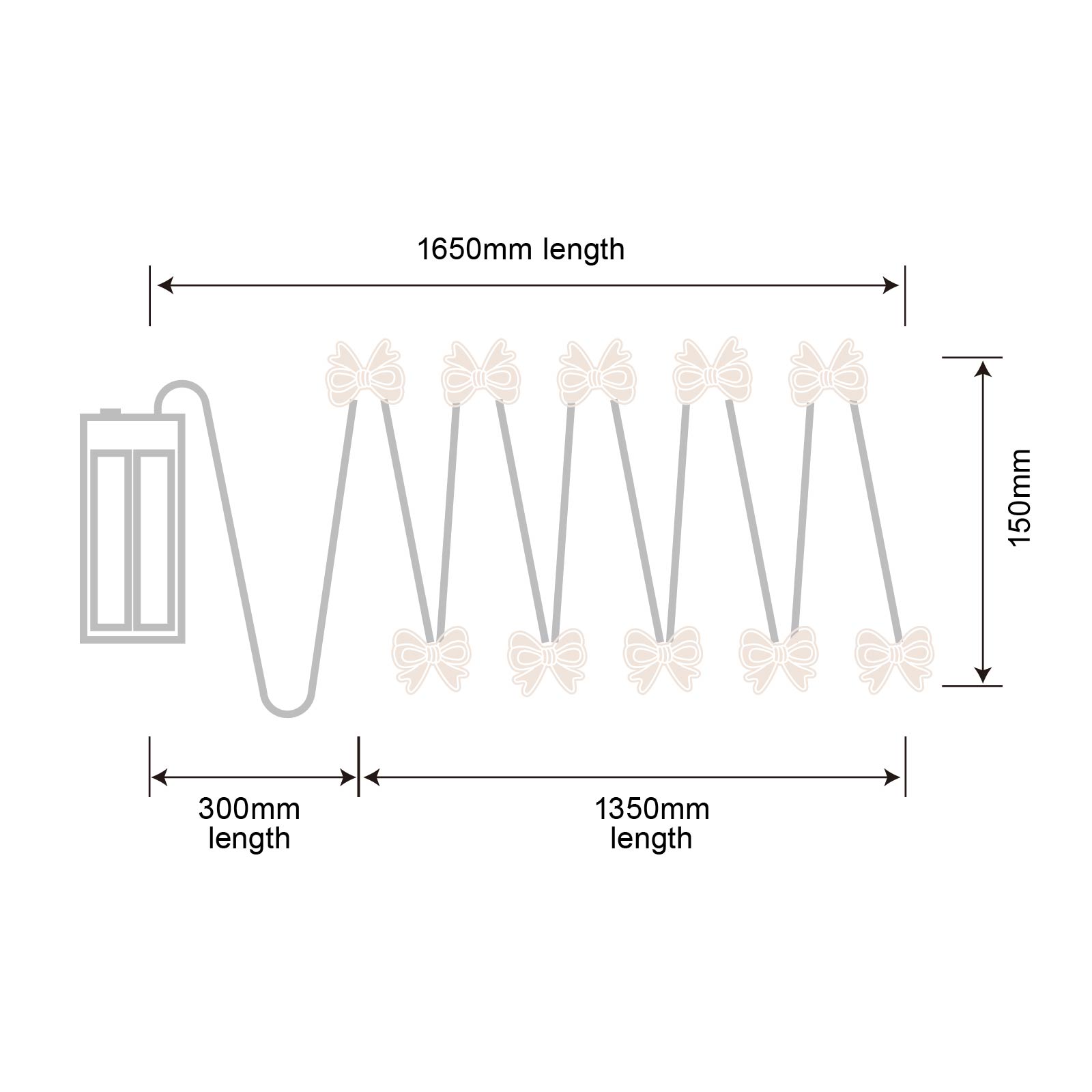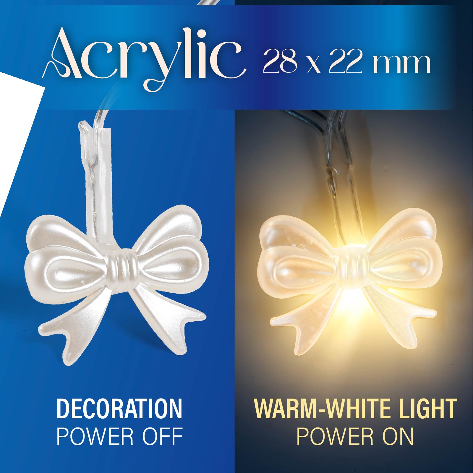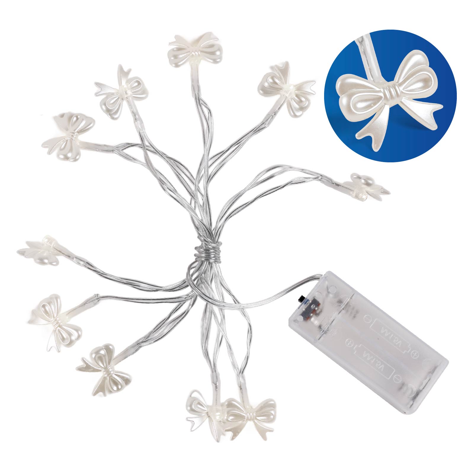 LG01-016These elegant string lights, battery-operated, feature a delicate, pristine white bow design. When lit, the white bows cast a serene glow, bathing your space in calm radiance and creating a timeless, magical atmosphere—perfect for cozy or sophisticated settings. Simple Elegance, Quick to Style: Our white LED string lights are soft and pliable, easy to drape and twine—no pro skills needed! Turn any corner into a sweetly captivating spot in an instant.