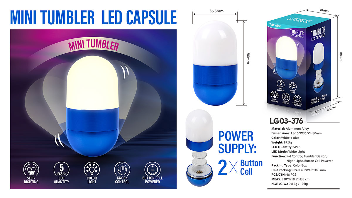 LG03-376Knock the Tumbler LED Capsule! Crafted in a unique capsule shape, its top part is an LED light. Designed as a roly - poly, it remains upright all the time.