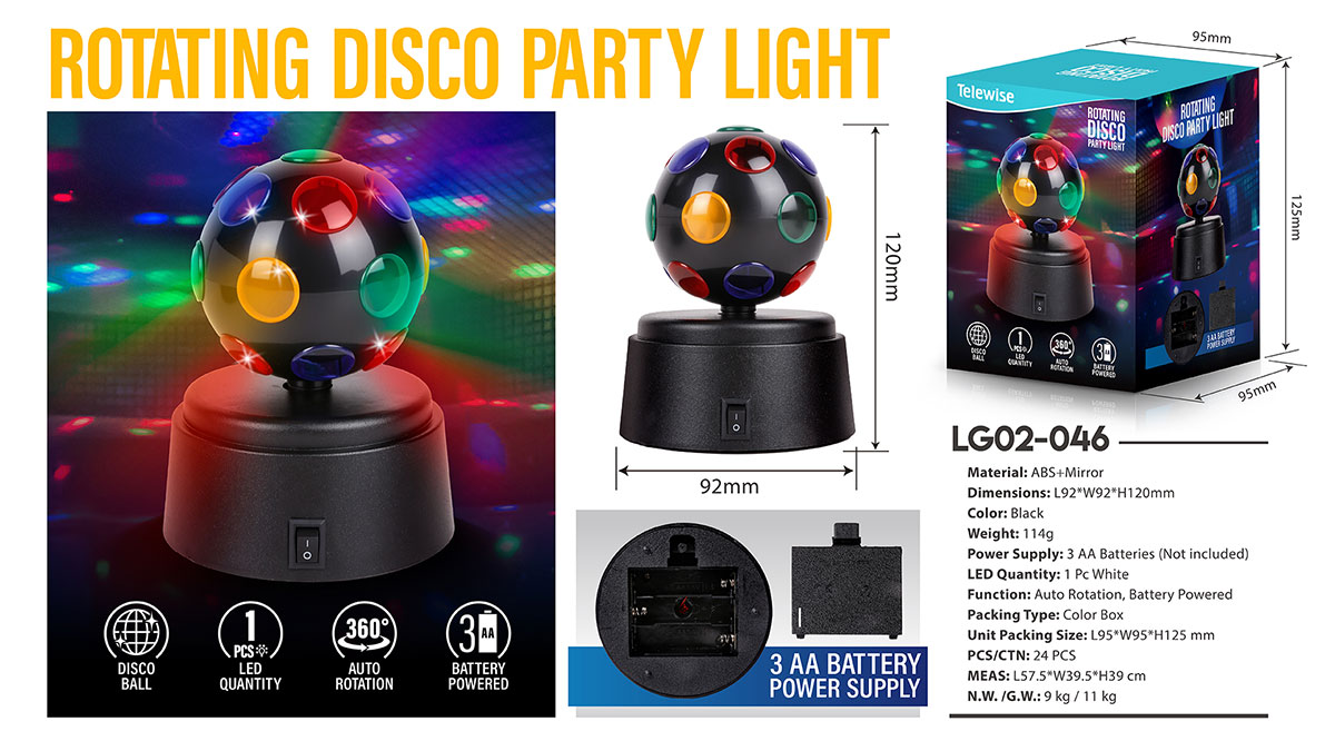 LG02-046Our amazing DISCO ball light! It can rotate on its own and project gorgeous ambient light rays, creating a lively atmosphere.