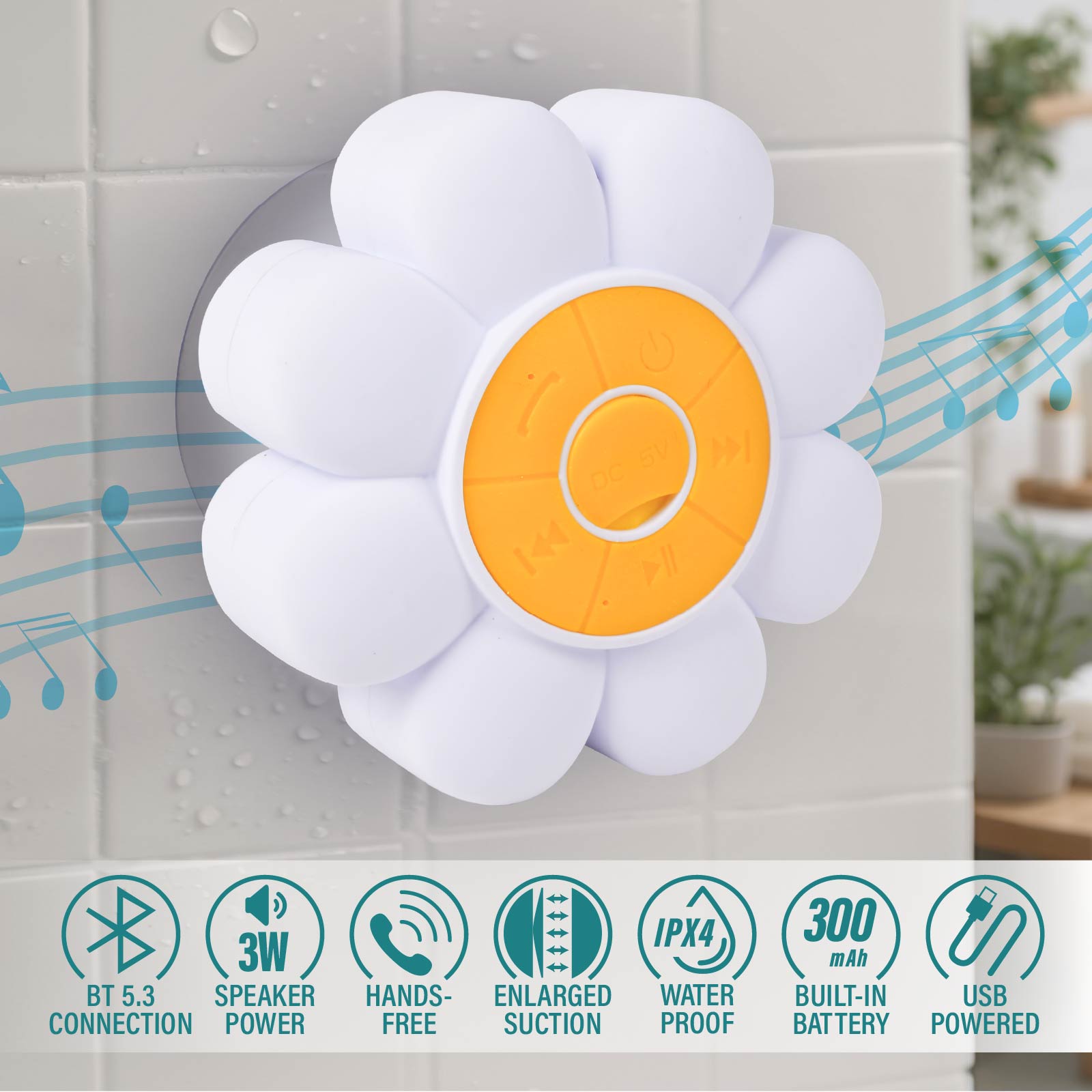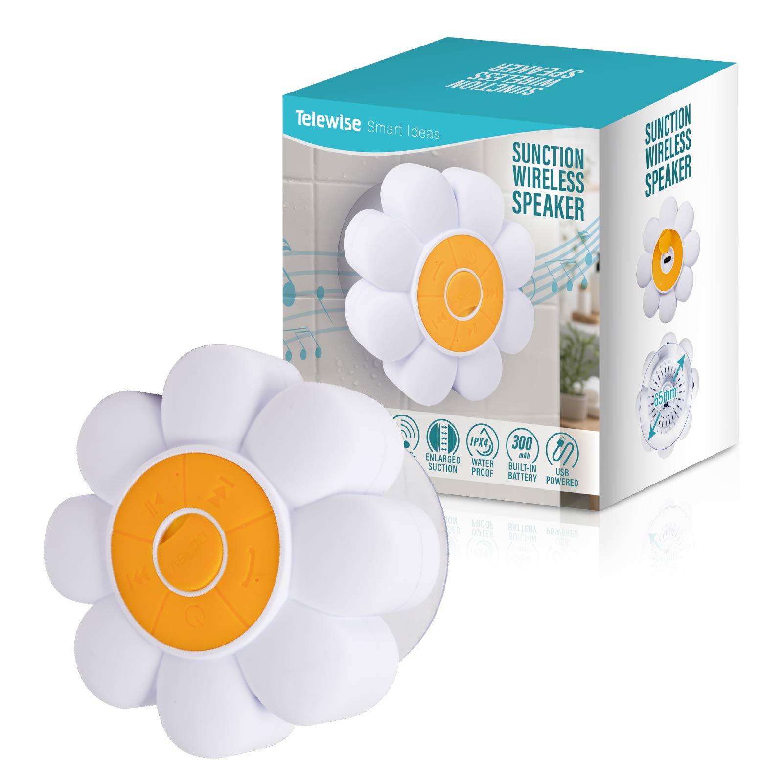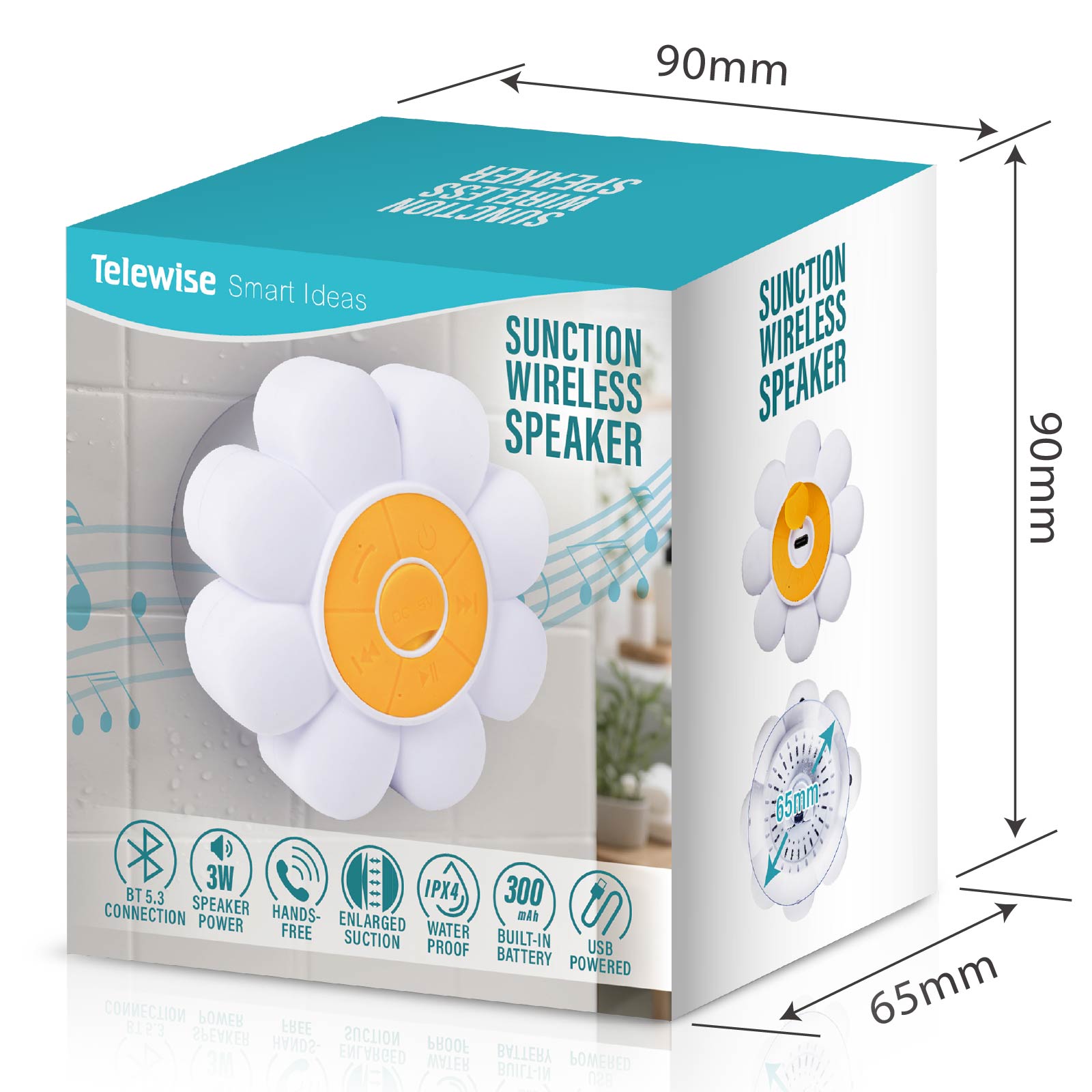 - Function : Bluetooth Speaker, Hands-free, IPX4 Waterproof, Sunction Design, Built-in Rechargeable Battery, USB Powered.
