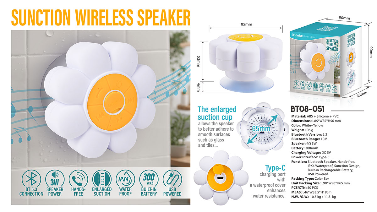 BT08-051Its waterproof build keeps the music going, even with splashes, features a built-in mic for hands-free calls, Strong suction cup hold, IPX4 water resistant.