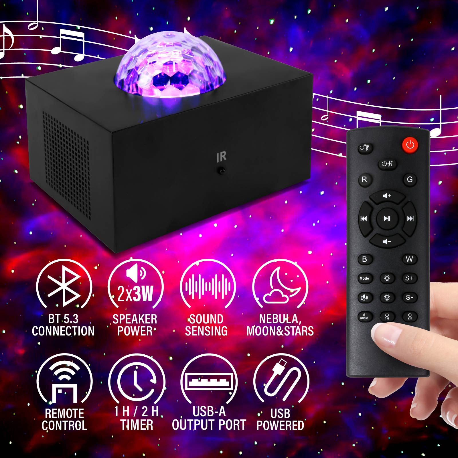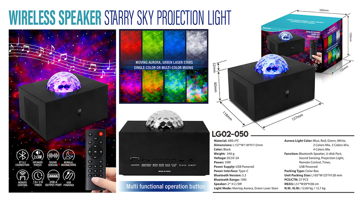 - Function : Bluetooth Speaker, U-disk Port, Sound Sensing, Projection Light, Remote Control, Timer, USB Powered