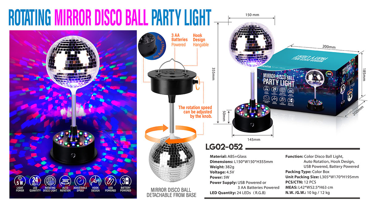 - Function : Color Disco Ball Light, Auto Rotation, Hook Design, USB Powered, Battery Powered