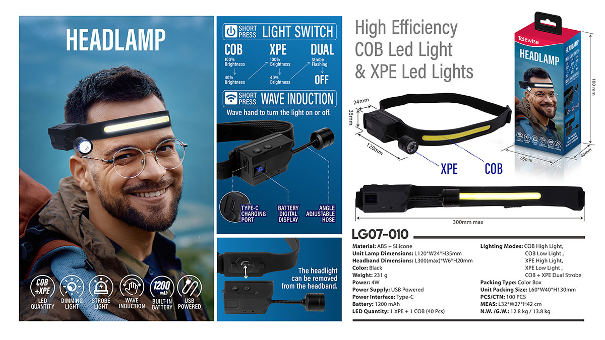 LG07-010The wave induction headlamp lets you control light with a simple wave, ideal for camping, hiking, working, running and more—super convenient and completely hands-free.