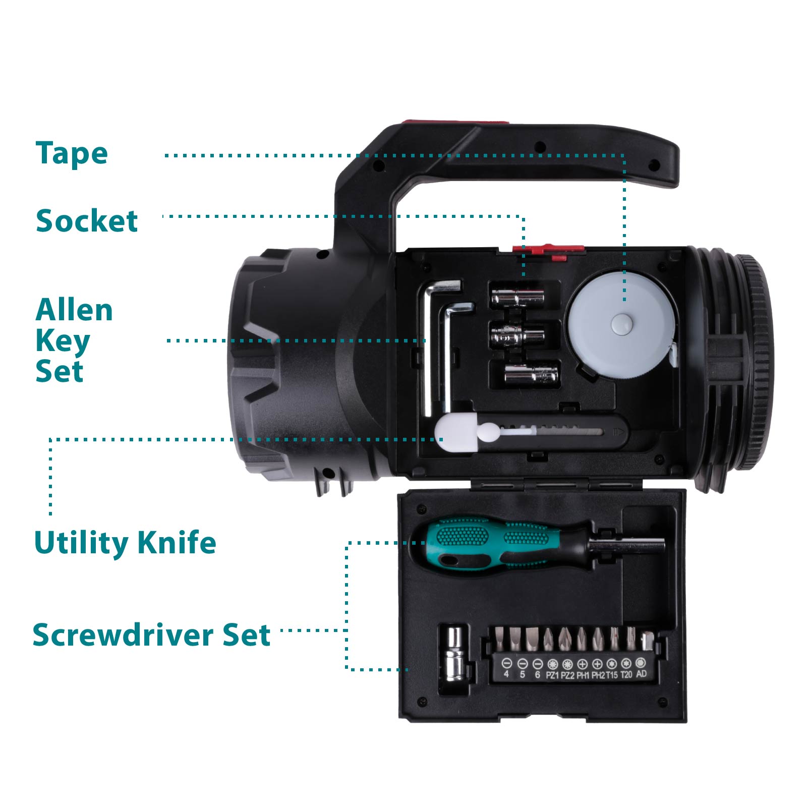 - Built-in Toolbox : Allen Key Set, Tape, Utility Knife, screwdriver set (10-piece bit)