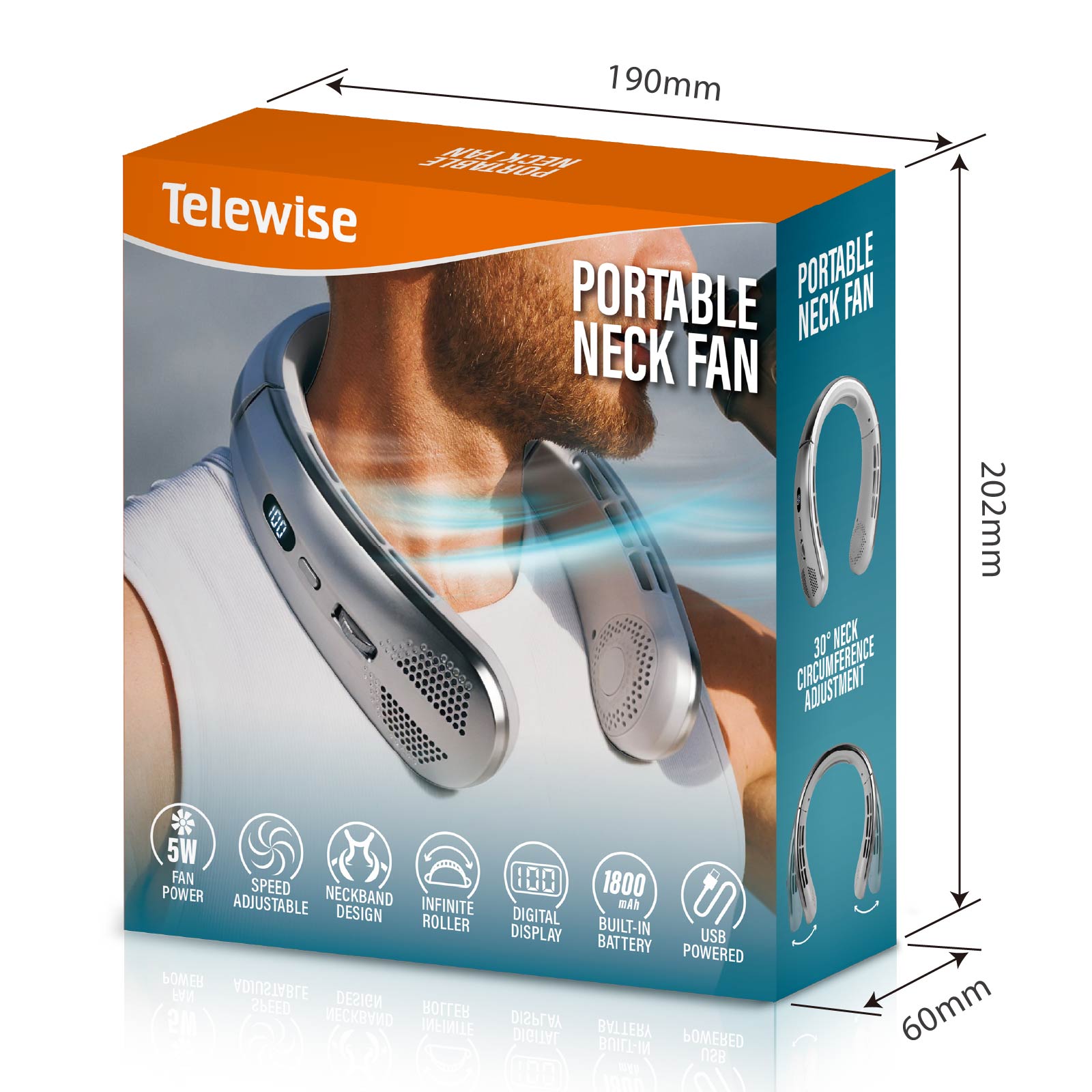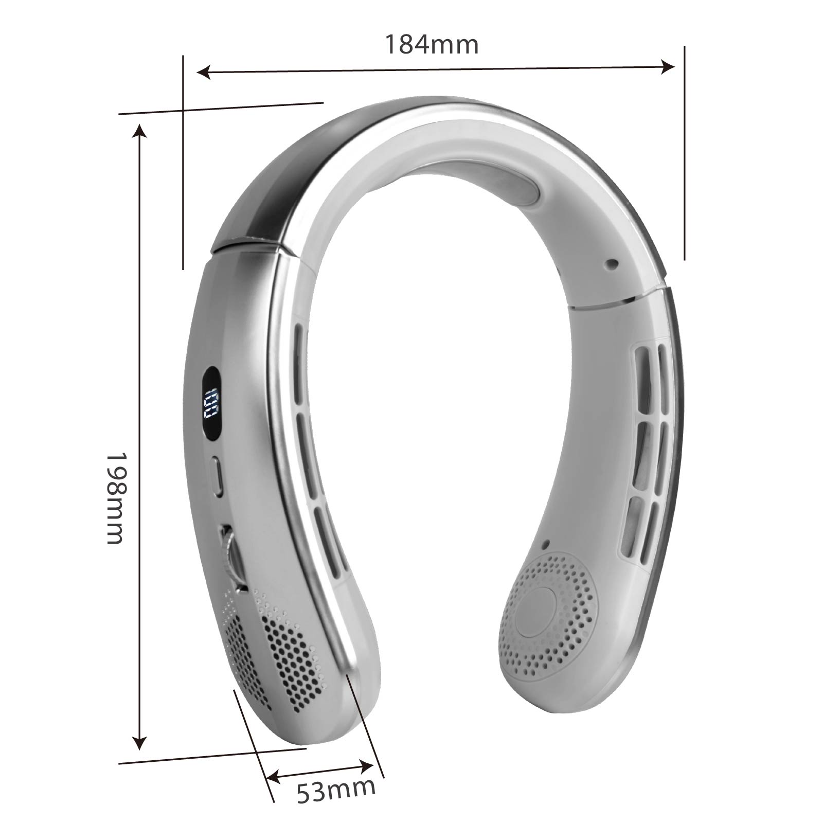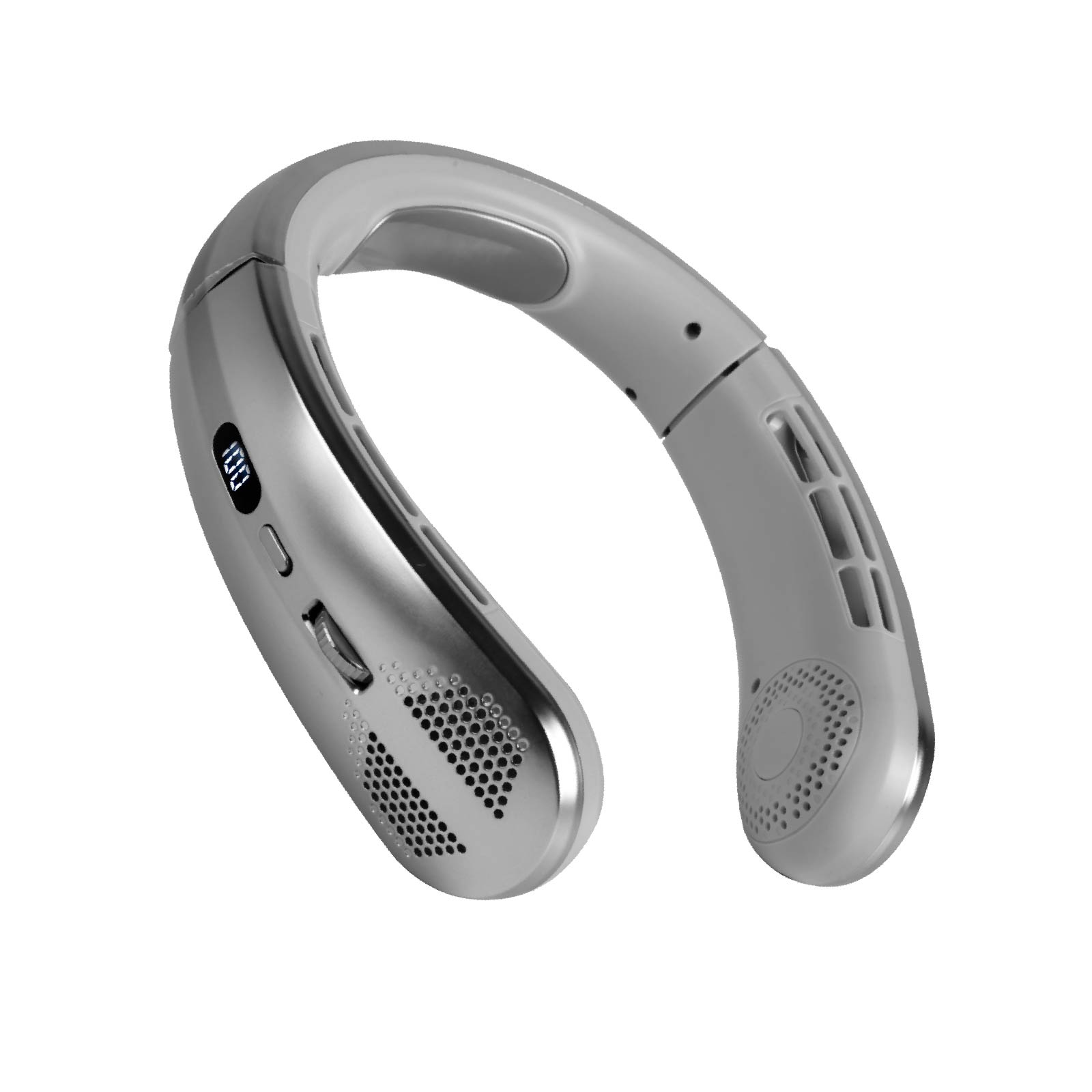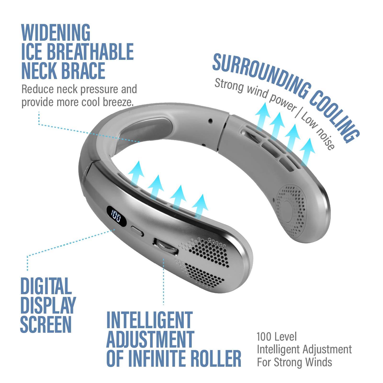 - Function : Widened ice - feeling neck brace, Infinite roller adjustment for wind speed, Digital display screen (for battery level and wind power), 30° neck circumference adjustment, USB Powered, Built-in Rechargeable Battery.