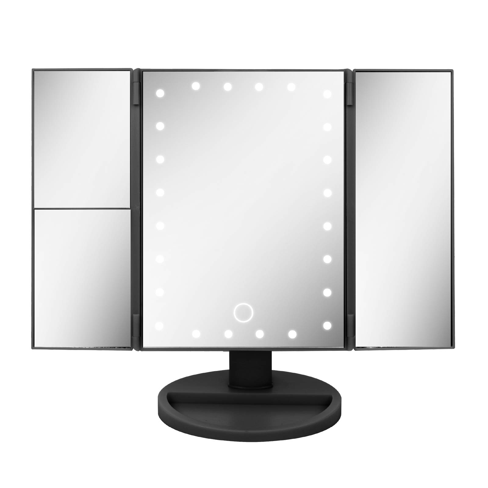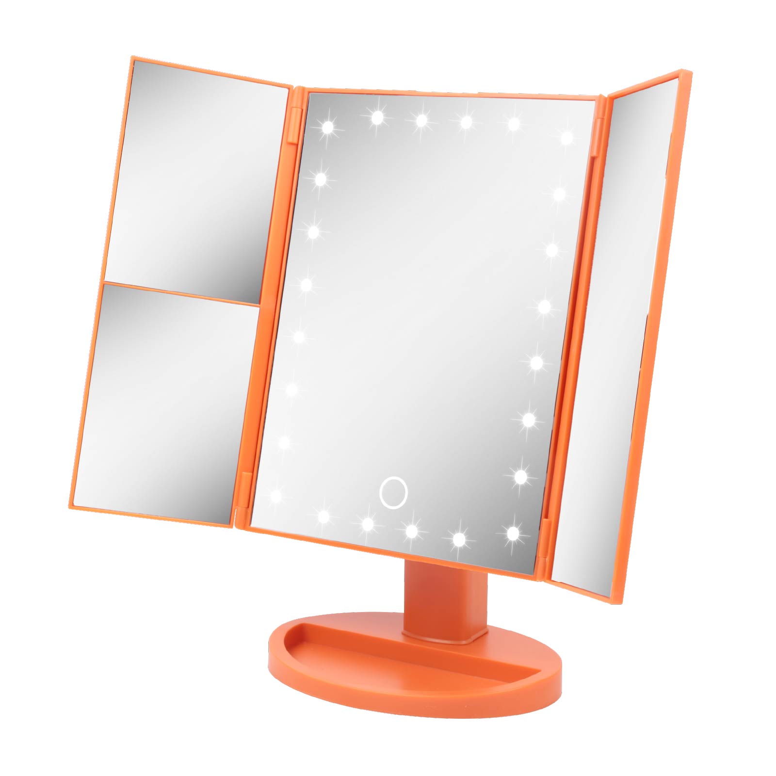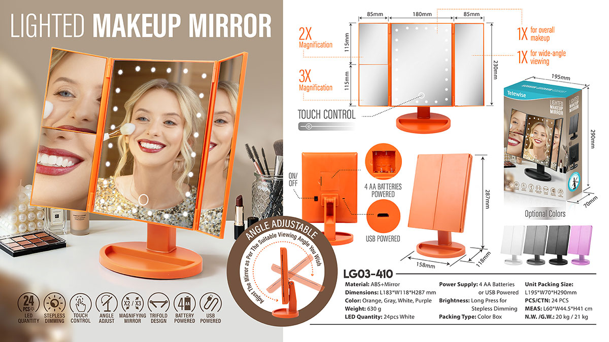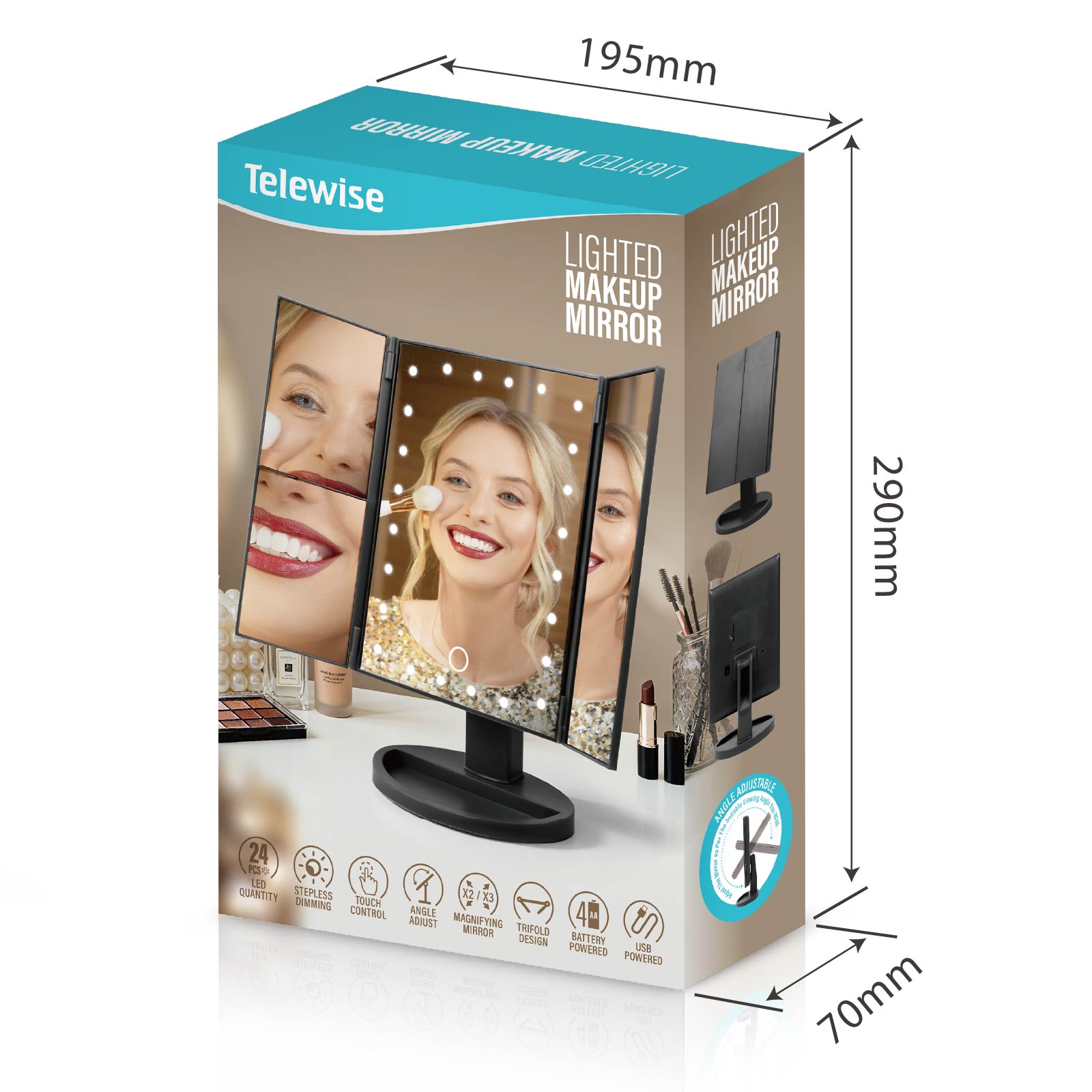 - Function : Stepless Dimming, Touch Control, Angle Adjustable, Magnifying Mirror, Trifold Design, 4 AA Batteries Powered, USB Powered