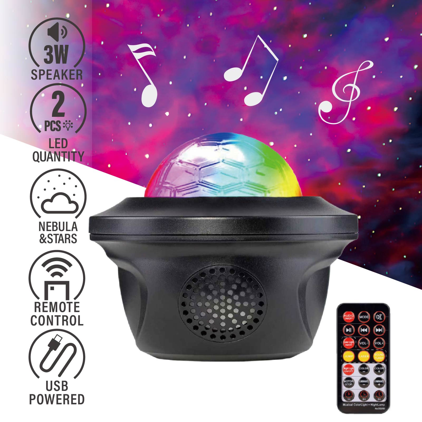 - Function : Bluetooth Speaker, Projection Light, White Noise, USB Powered
