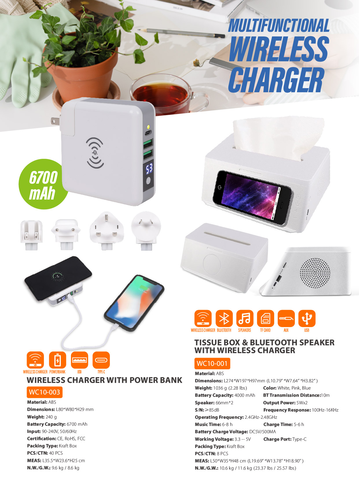 WC10-001This is a multifunctional tissue box cover with a Bluetooth speaker, which you can use to play music. It is also a phone holder with wireless charging function, you can not only use this cellphone station to charge your phone, but also can charger another phone or earbuds by the data cable at the same time.