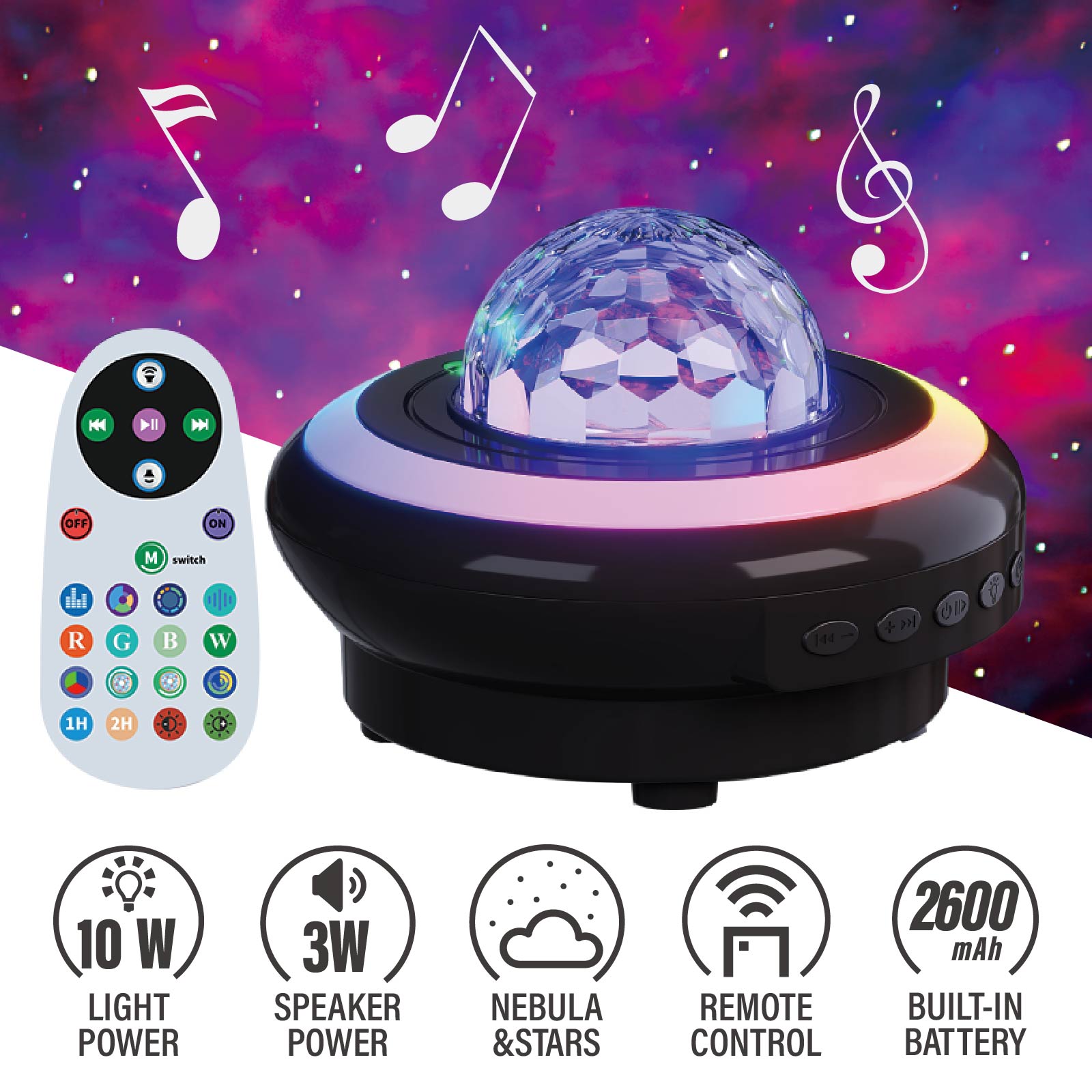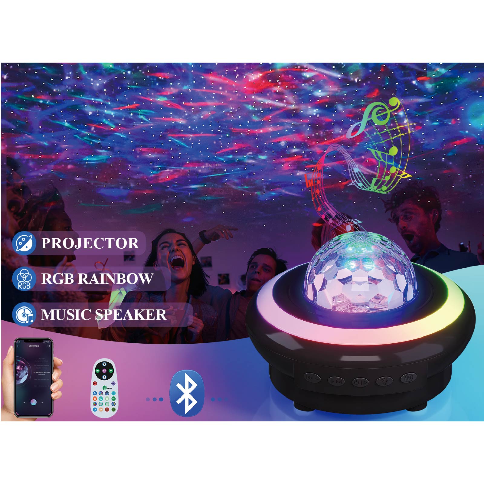- Function : Bluetooth Speaker, Projection Light, White Noise, USB Powered