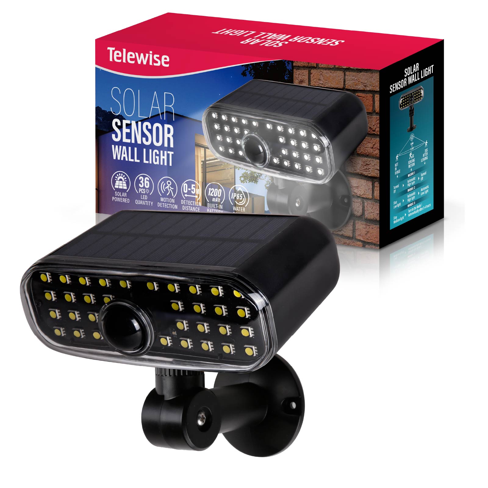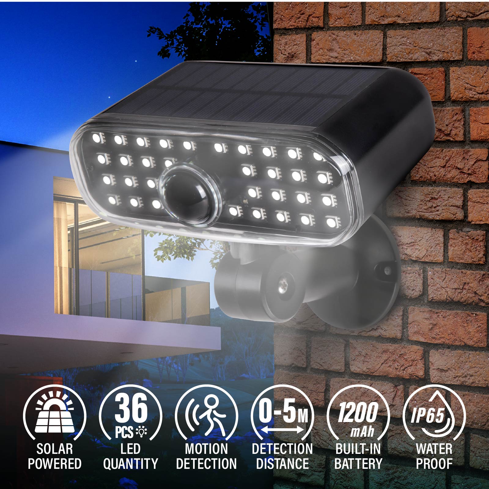 - Function : Motion Sensor, Solar Powered, Angle-adjustable bracket, IP65 Waterproof, Built-in Rechargeable Battery.