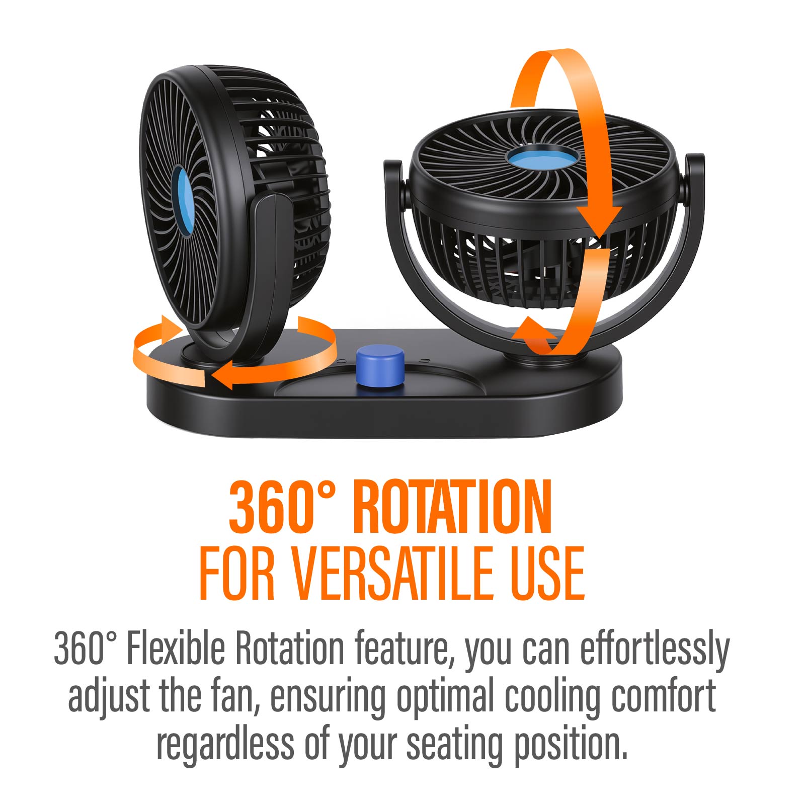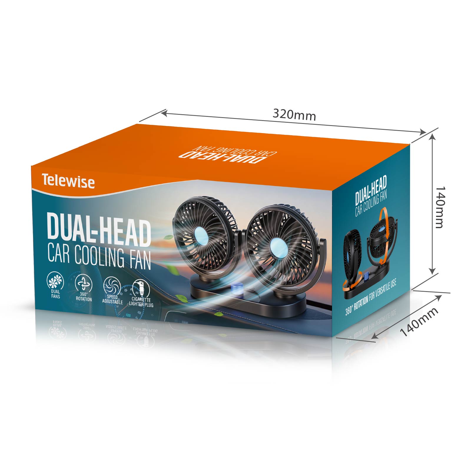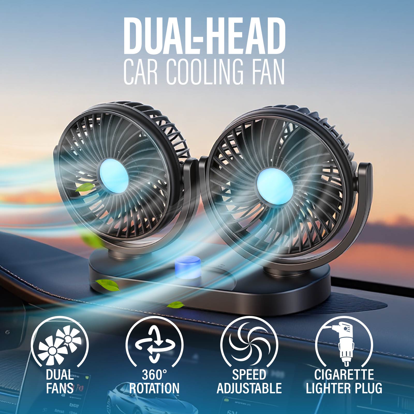 - Function : Dual-Fan, Angle Adustable, Powerful Motor, Cigarette Lighter Adapter.