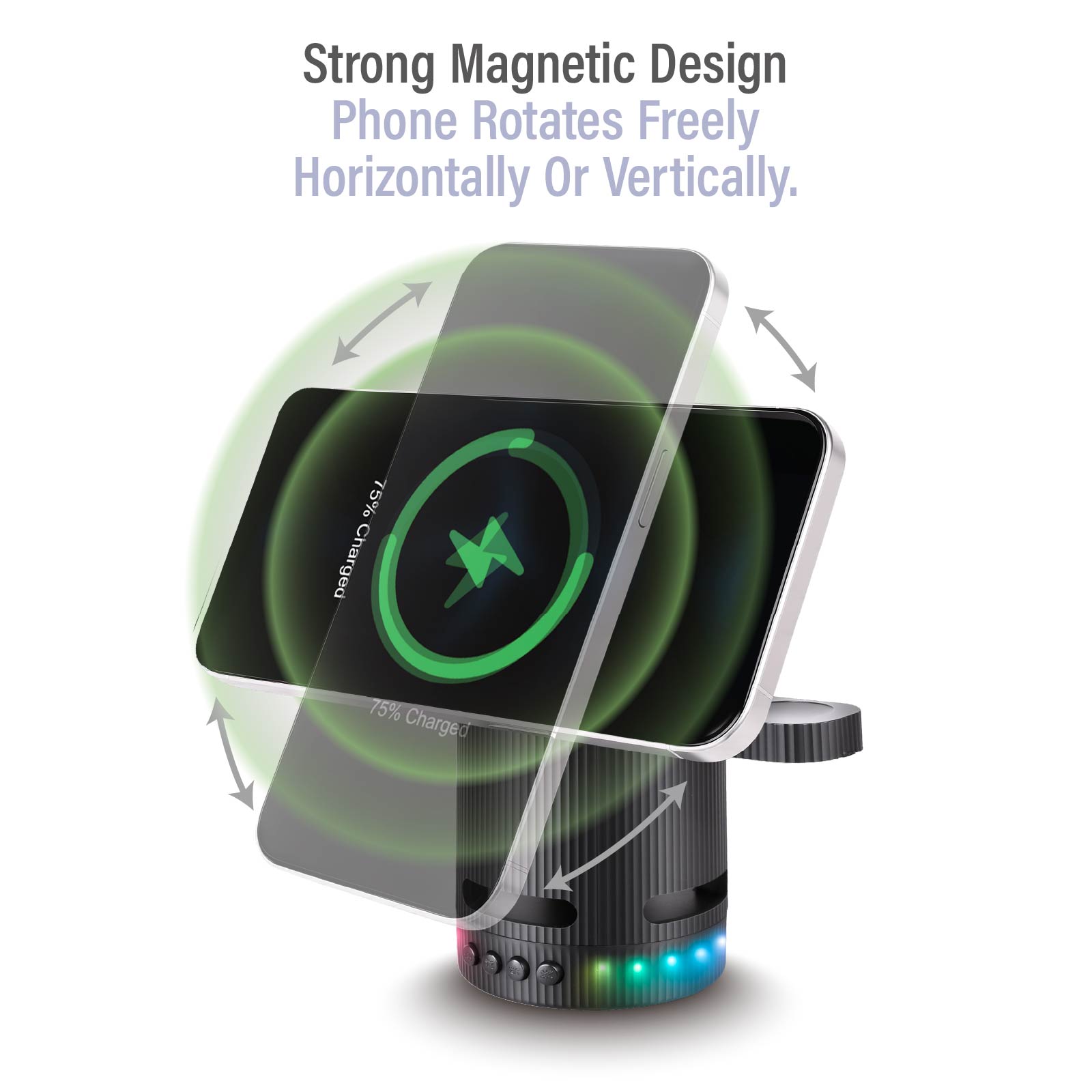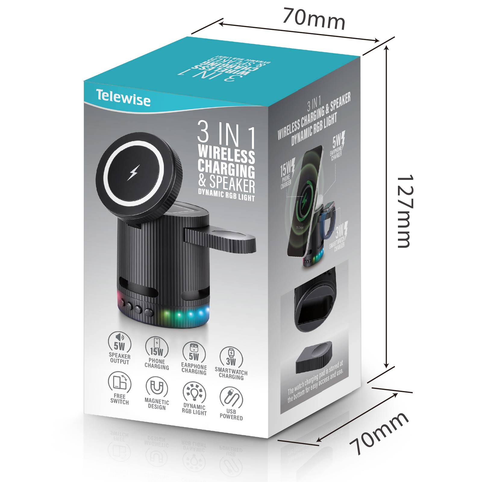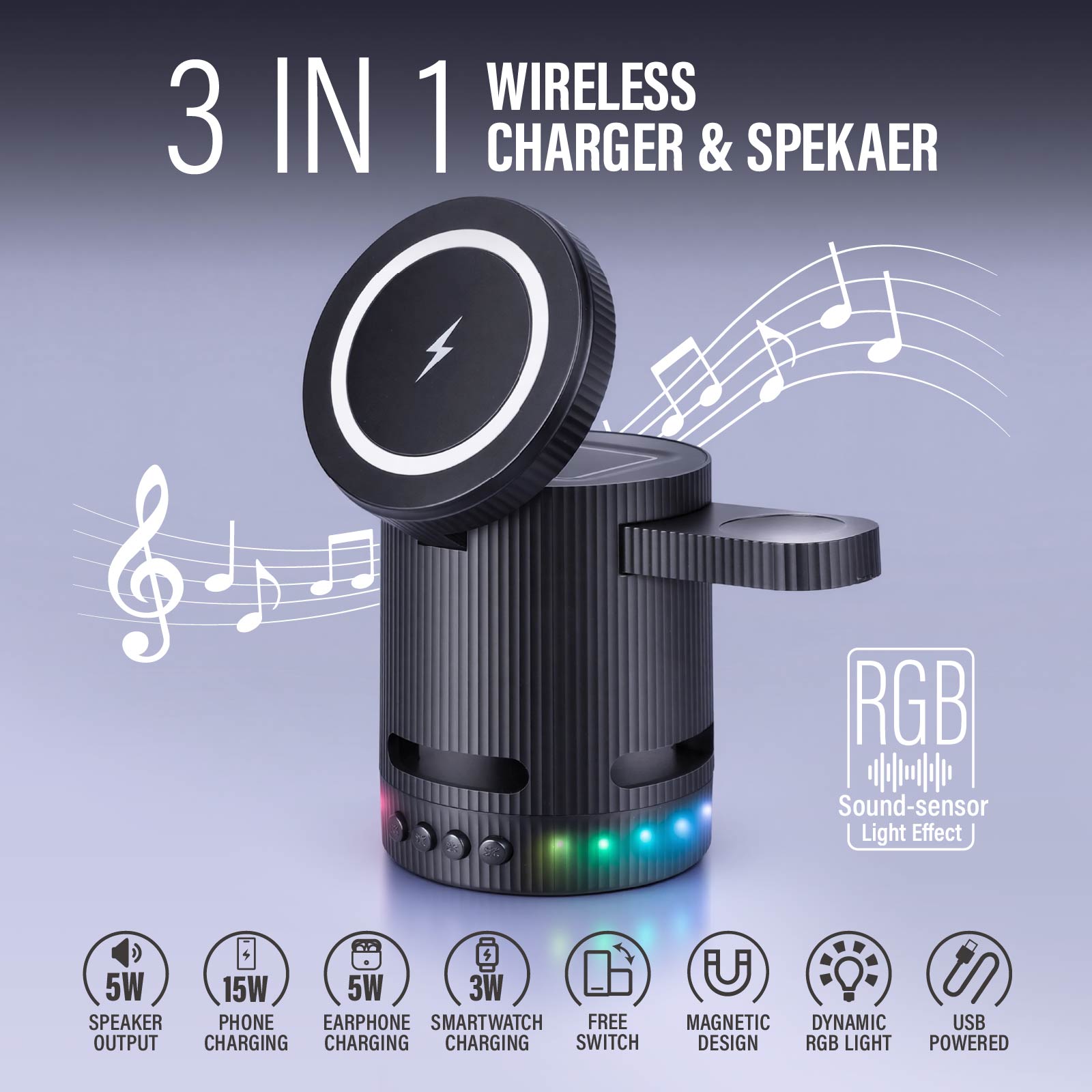 - Function : Bluetooth Speaker, Wireless Charger, Magnetic Design, RGB Dynamic Colors, USB Powered.