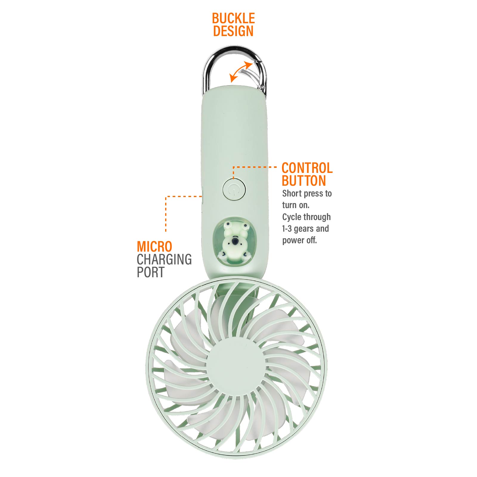 - Function : Adjustable Fanspeed, Buckle Design, USB Powered, Built-in Rechargeable Battery