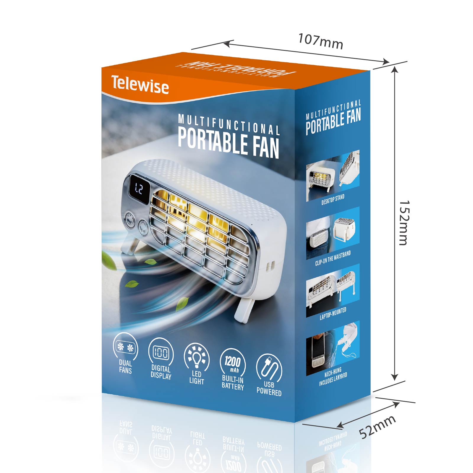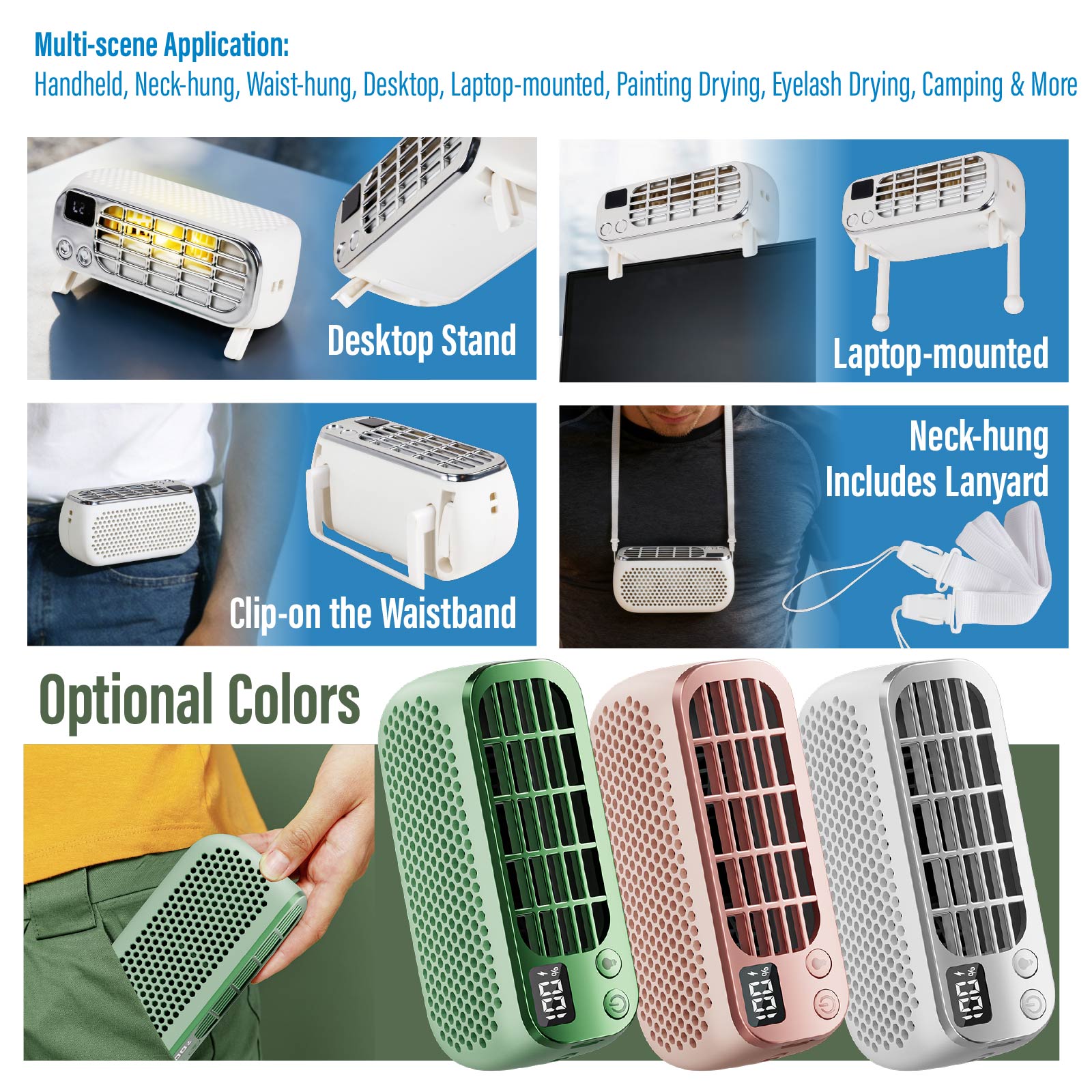 - Multi-scene Application : Handheld, Neck-hung, Waist-hung, Desktop, Laptop-mounted, Painting Drying, Eyelash Drying, Camping & More