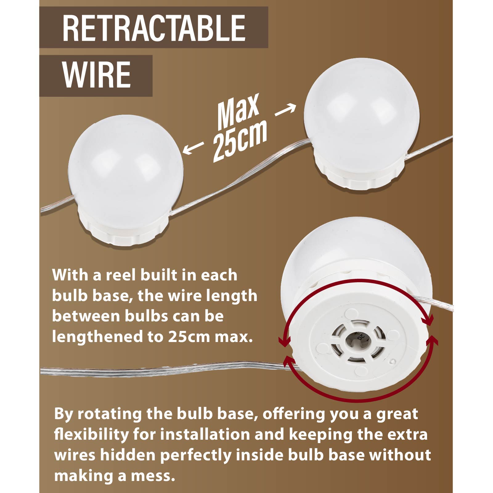 LG03-435With a reel built in each bulb base, the wire length between bulbs can be shortened to merely 25cm, offering you a great flexibility for installation and keeping the extra wires hidden perfectly inside bulb base without making a mess.