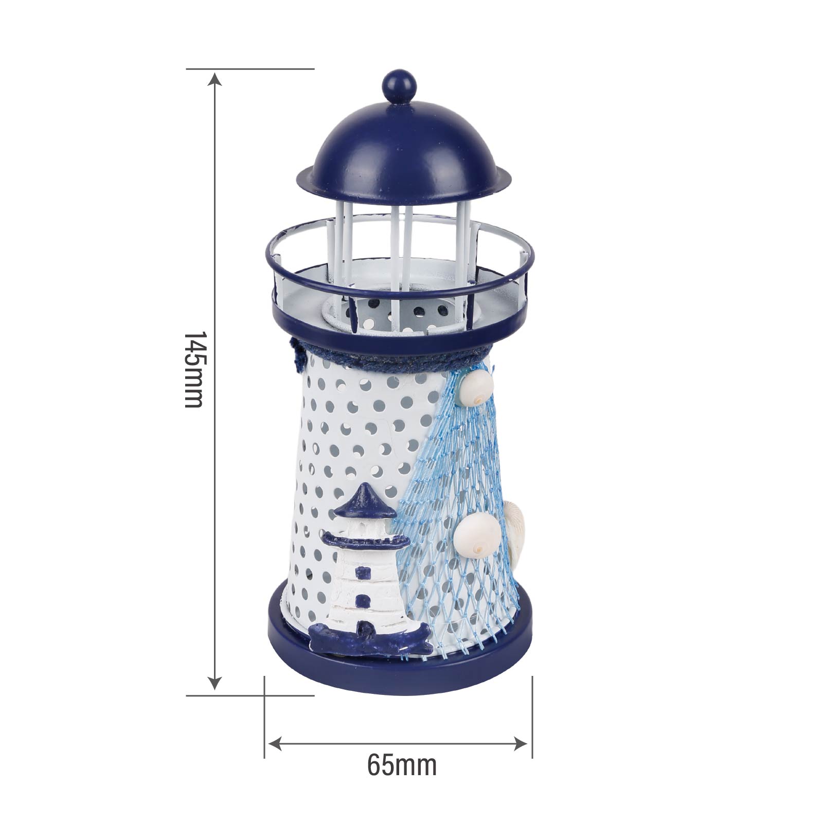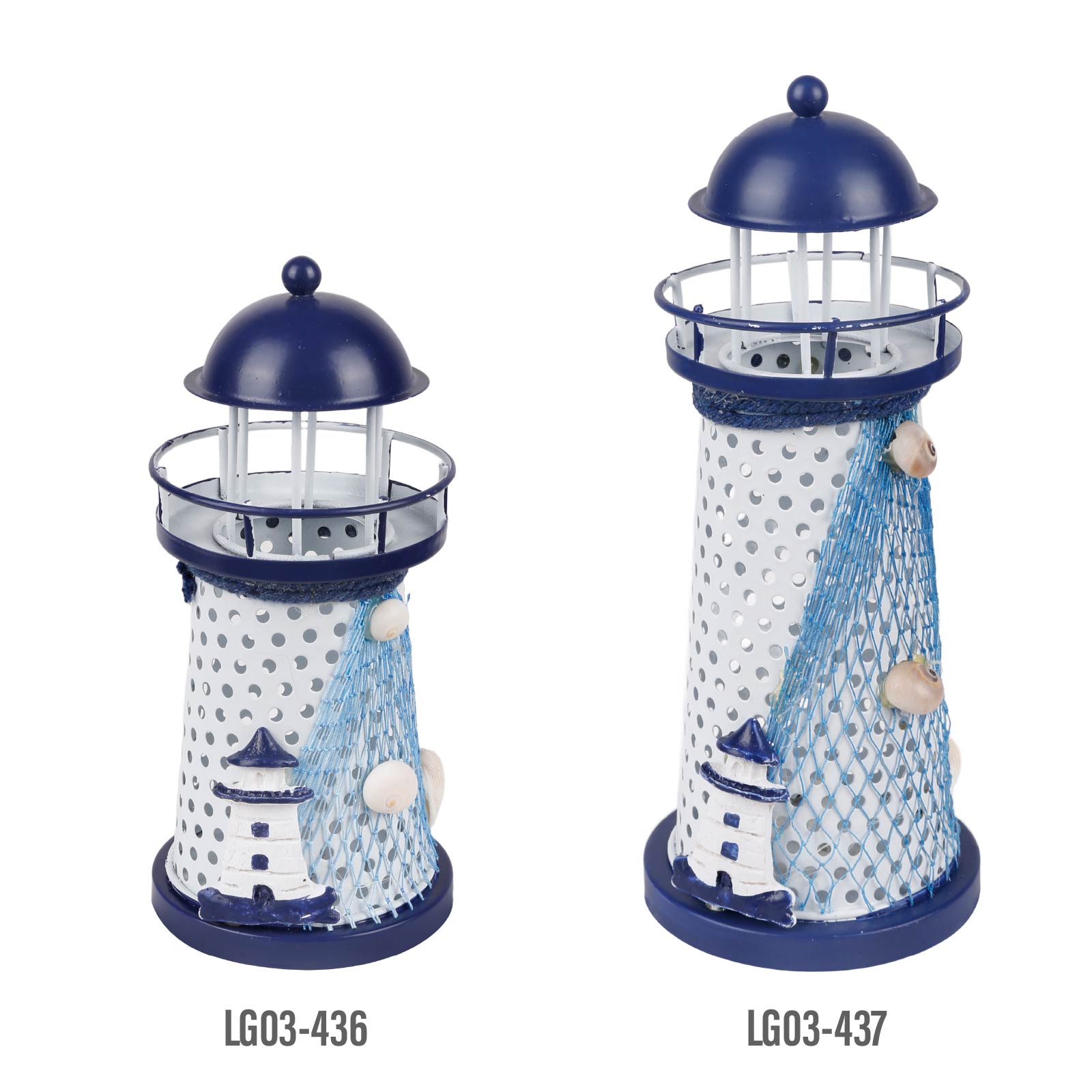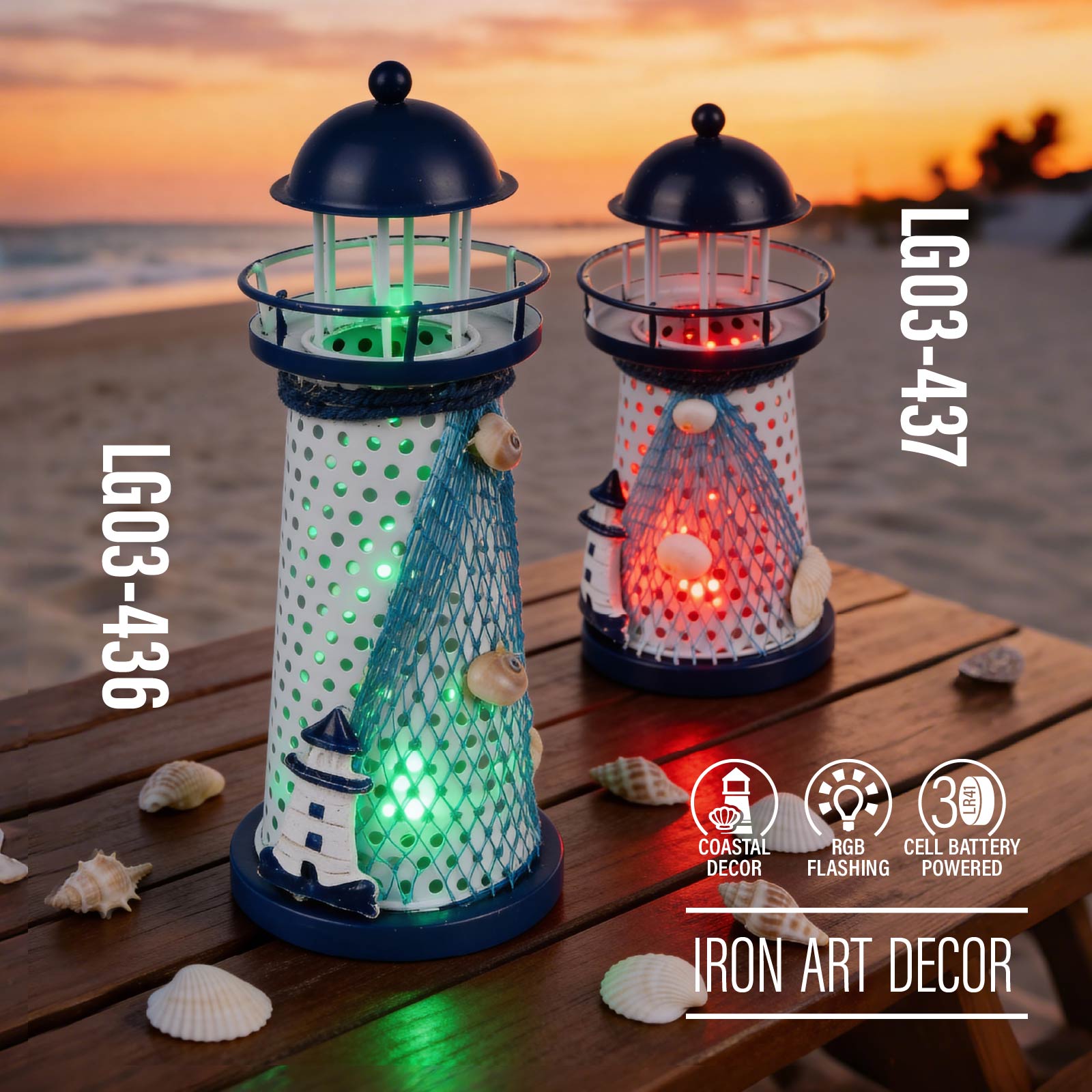 LG03-436Bring the magic of the coastline to your space! This eye-catching iron art lighthouse, adorned with authentic fishing net and natural shells, glows with vibrant red, blue and green flashing lights. Perfect for adding a whimsical nautical vibe to your home, patio or party.