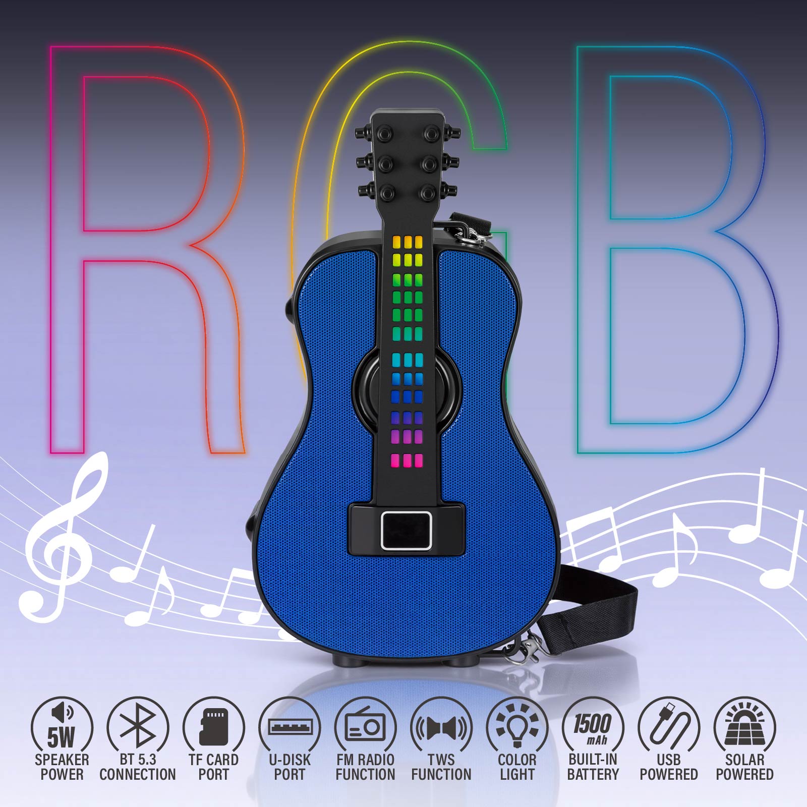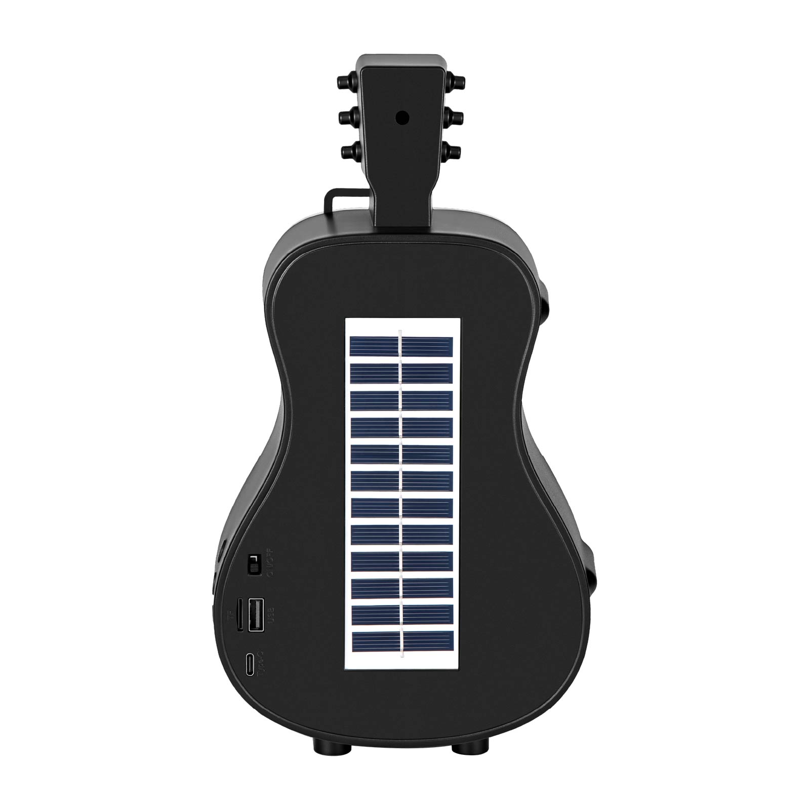 BT03-413A guitar that Sings !Wireless Bluetooth speaker, sound & style in one. Function: Bluetooth Speaker, TF Card Port, U-Disk Port, FM Radio, TWS, Built-in Rechargeable Battery, USB Powered, Solar Powered.
