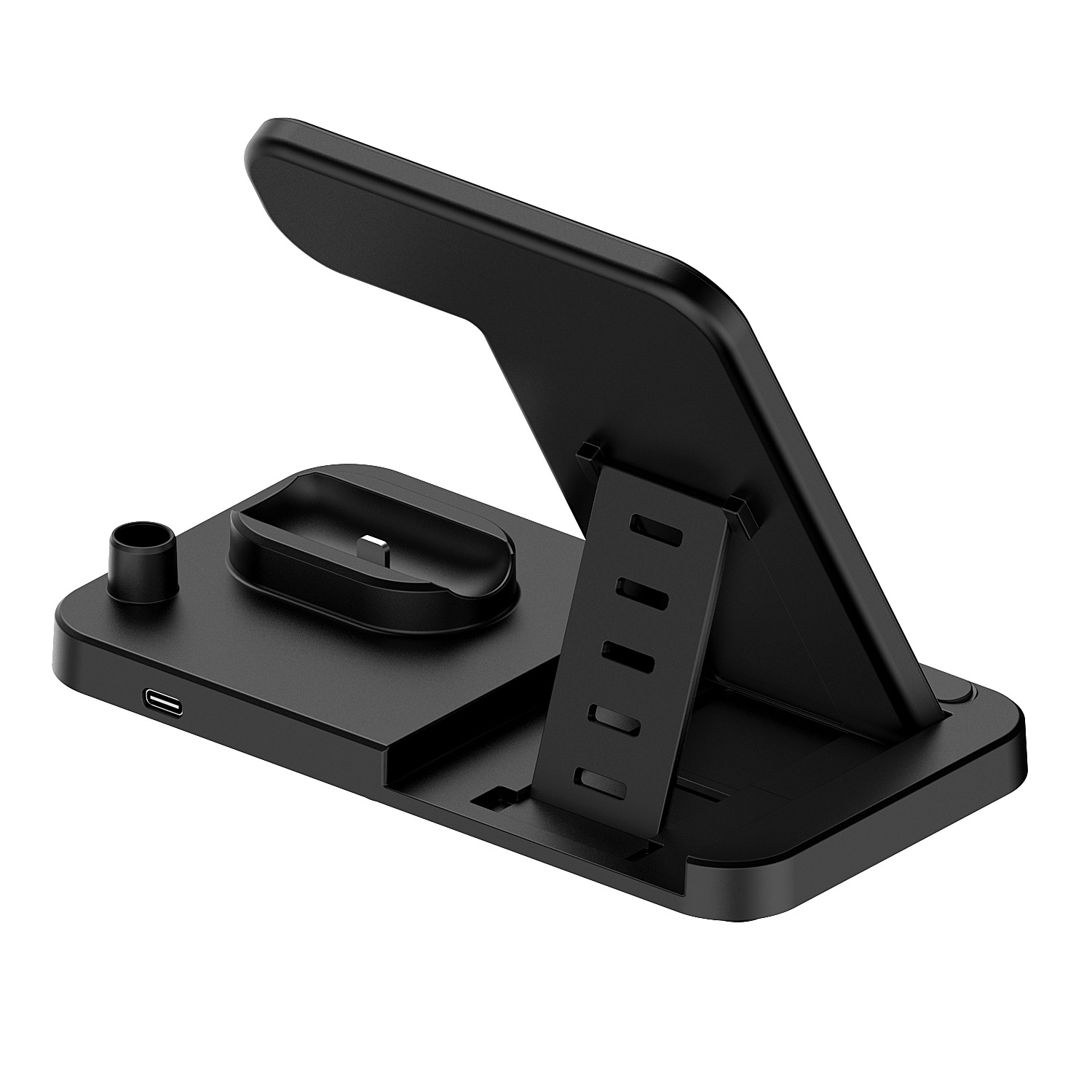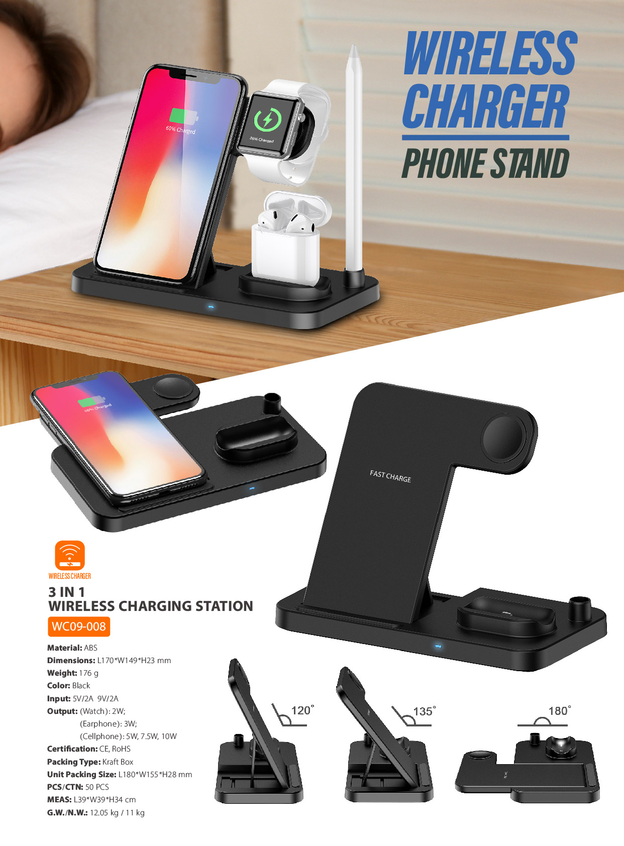 WC09-008Ergonomic stand design, charging your phone vertically or horizontally, enjoys movie and music without interrupting while charging.