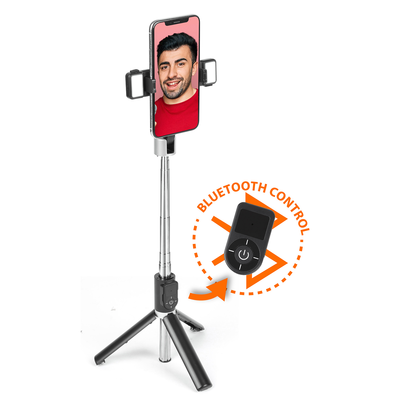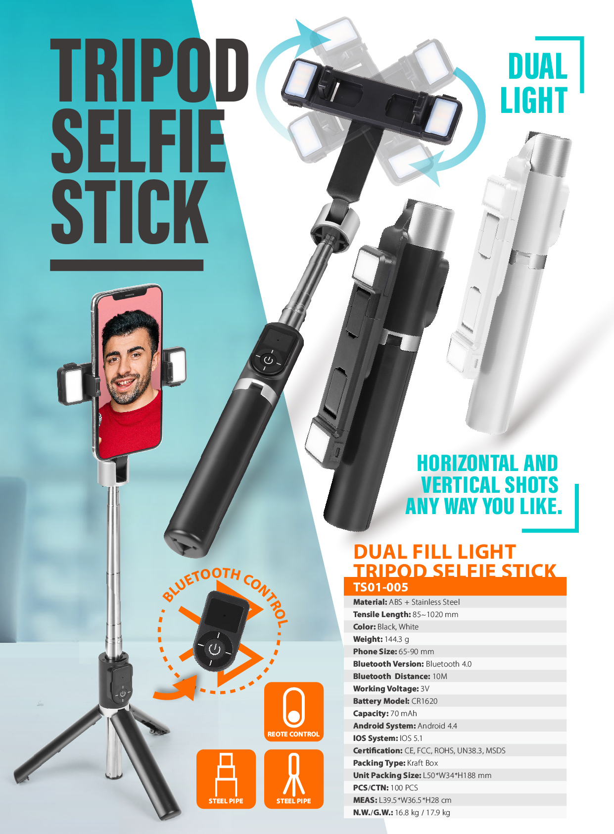 TS01-005With dual fill light, removable bluetooth remote control, horizontal and vertical shots any way you like.