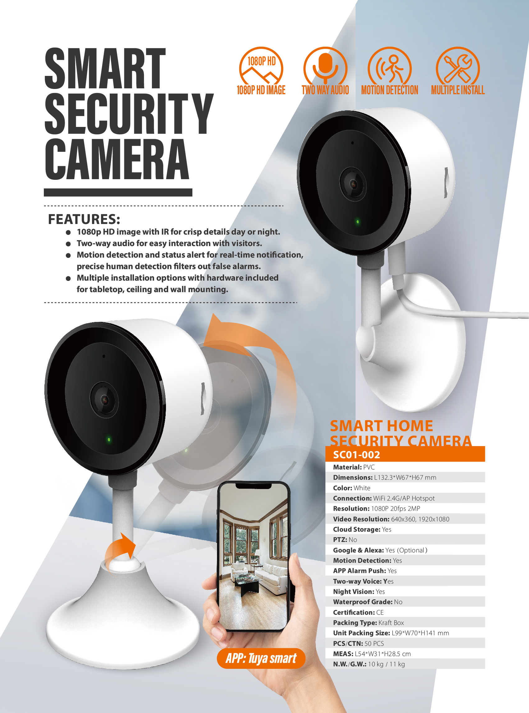 SC01-0021080p HD image with IR for crisp details day or night. Two-way audio for easy interaction with visitors. Motion detection and status alert for real-time notification, precise human detection filters out false alarms. Multiple installation options with hardware included for tabletop, ceiling and wall mounting.