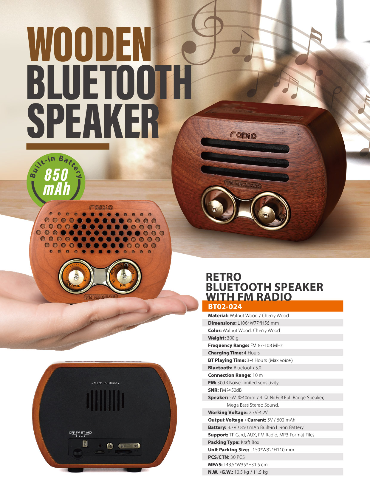 BT02-024Support: TF Card, AUX, FM Radio, MP3 Format Files