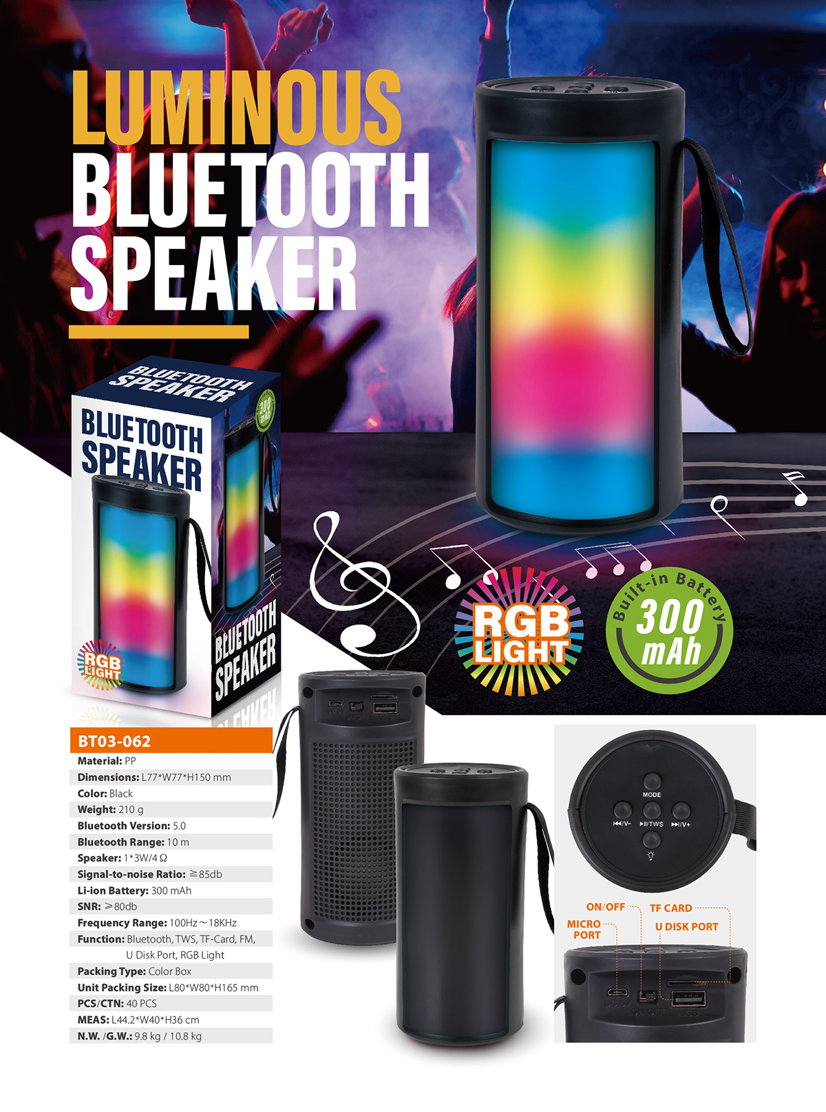 - Function : Bluetooth, TWS, TF-Card, FM, U Disk Port, RGB Light