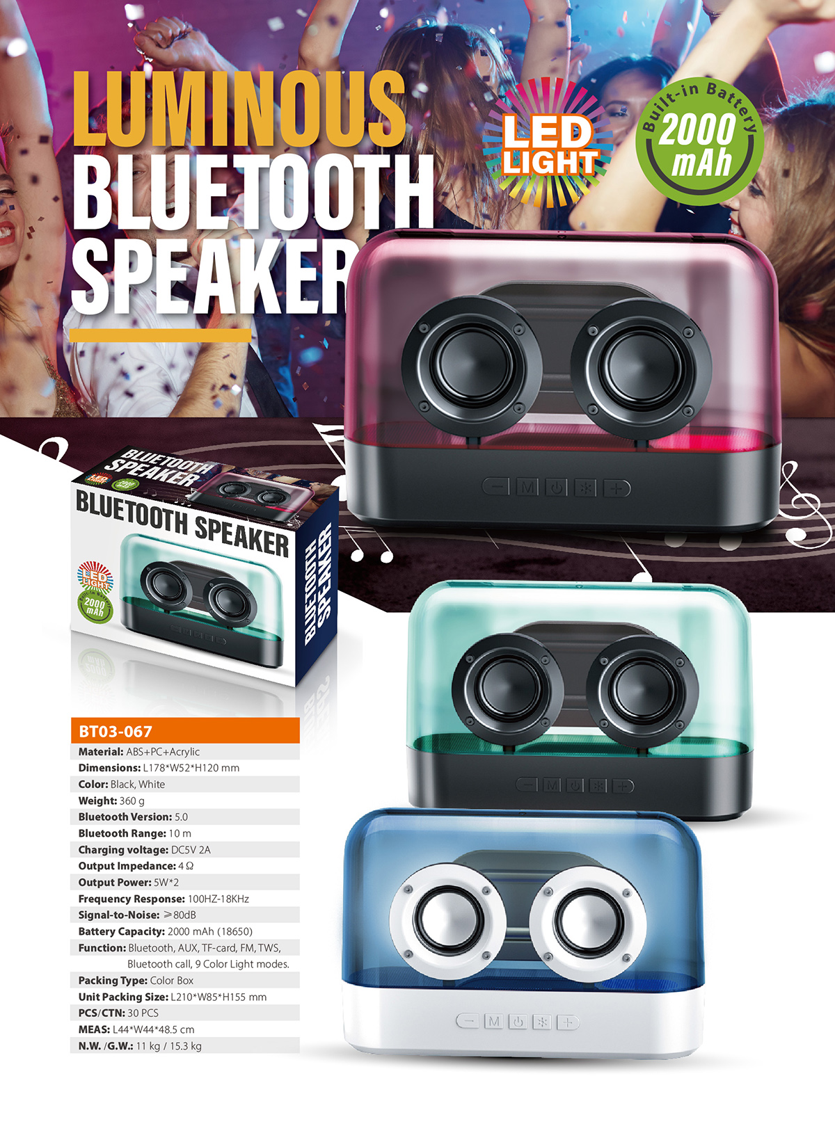 BT03-067The perfect sound quality makes the Bluetooth speaker ideal for outdoors and indoors, rain or shine to enjoy your music. The portable and compact design also makes the speaker used as a unique led night light, which creates a romantic atmosphere to light up your space.