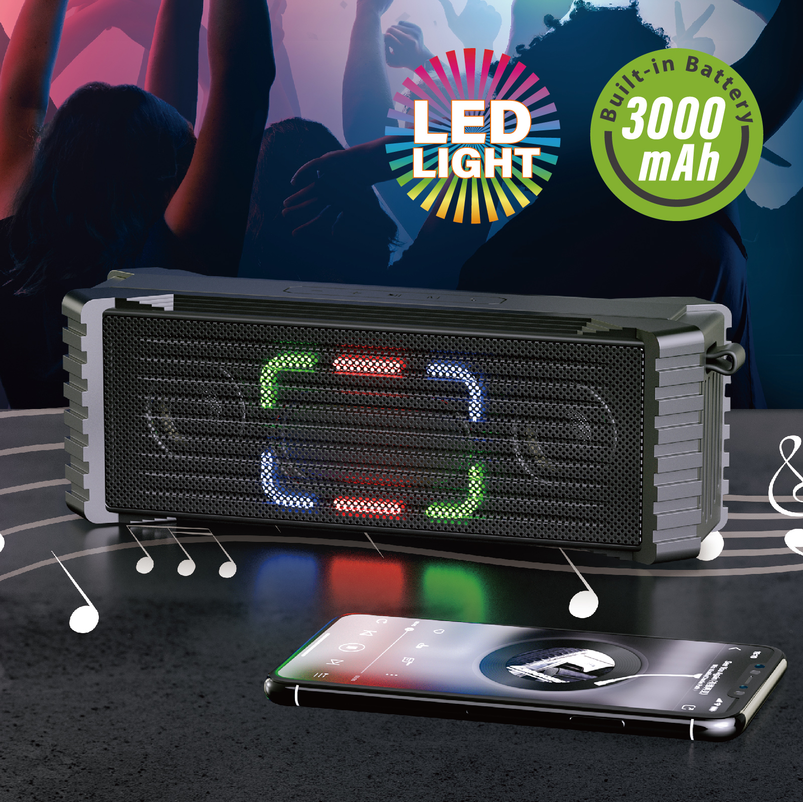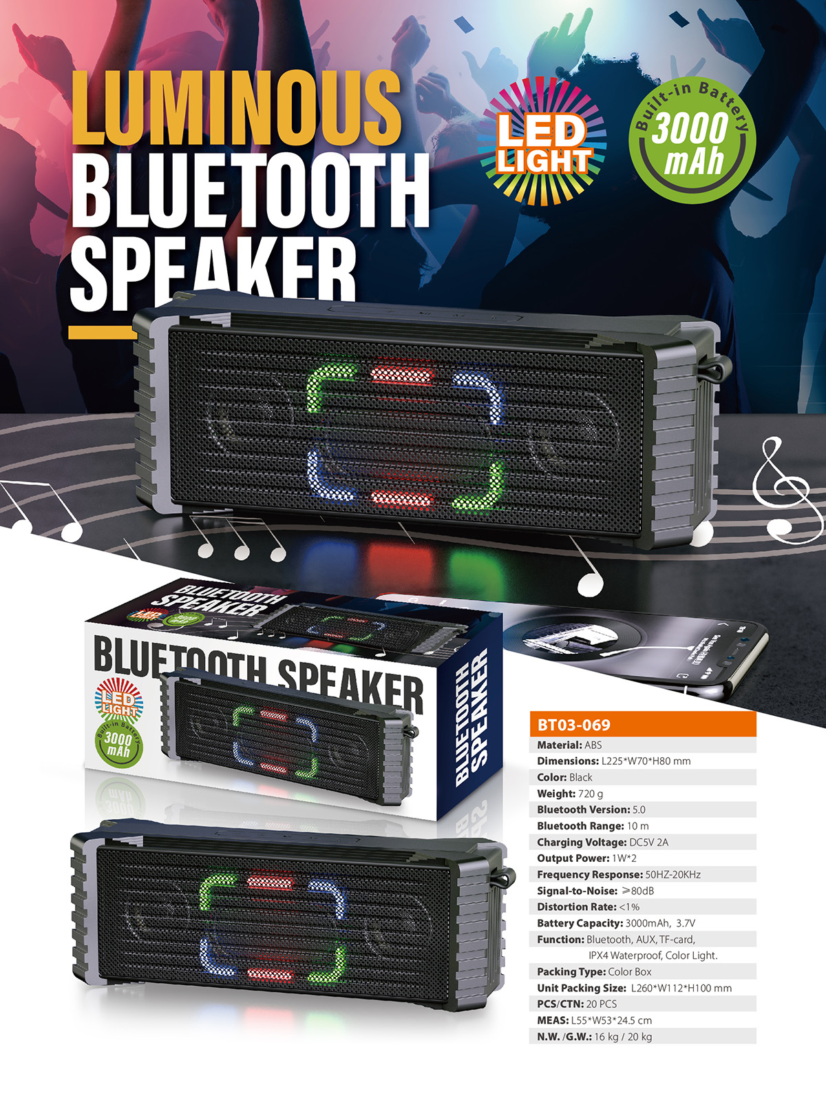 BT03-069The perfect sound quality makes the Bluetooth speaker ideal for outdoors and indoors, rain or shine to enjoy your music. The portable and compact design also makes the speaker used as a unique led night light, which creates a romantic atmosphere to light up your space.