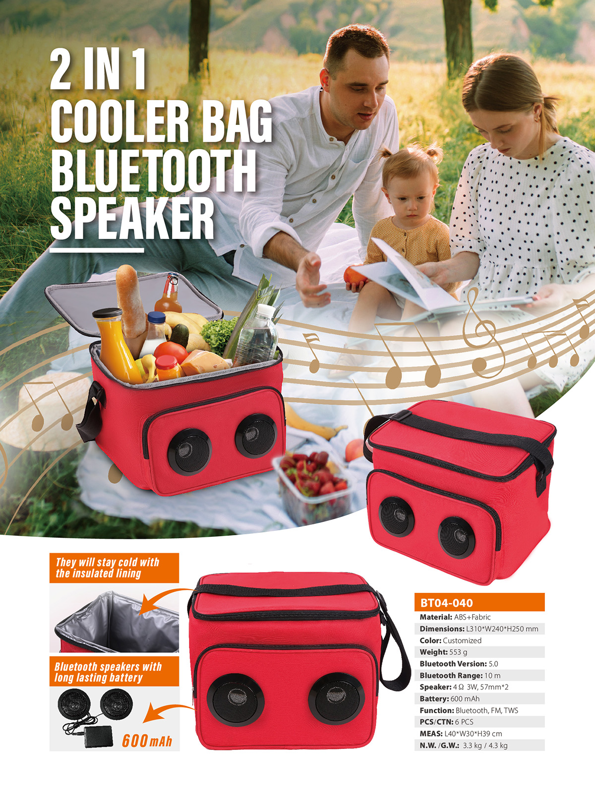 BT04-040The foods and drinks will stay cold with the insulated lining and you jam out to tunes with the built in speaker. FM, TWS.