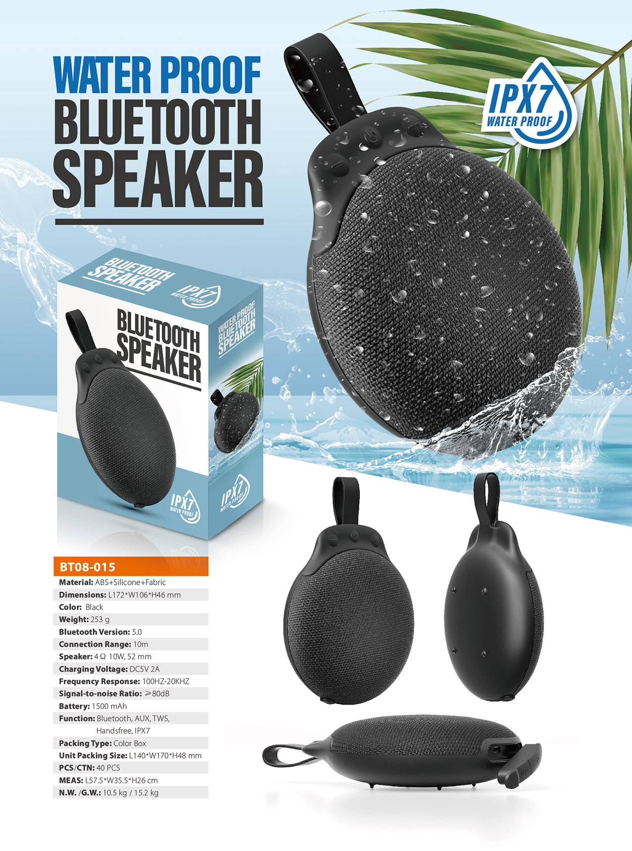 - Function : Bluetooth, AUX, TWS, Handsfree, IPX7