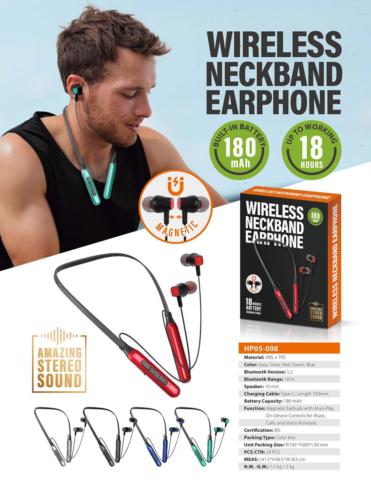 HP05-008Comfort and secure fit : With Lightweight and ergonomic design, neck earphone is a great combination of comfort and stability with ear-hook and in-ear fitting designed for strenuous workouts for outdoor or home.