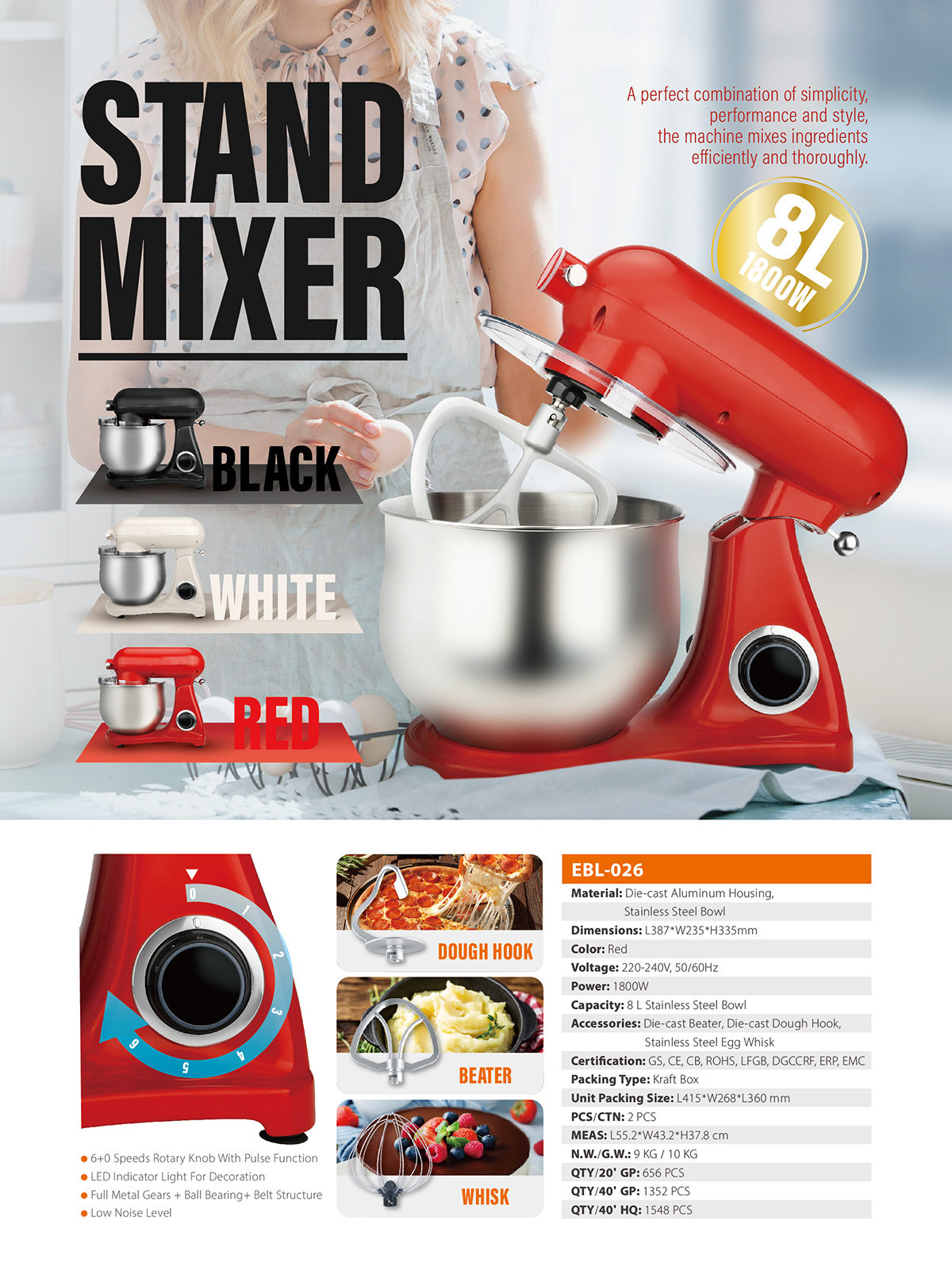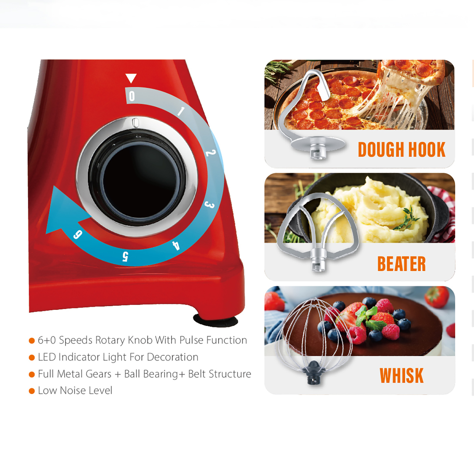 Standard Accessories: Die-cast Beater, Die-cast, Dough Hook, Stainless Steel Egg Whisk。