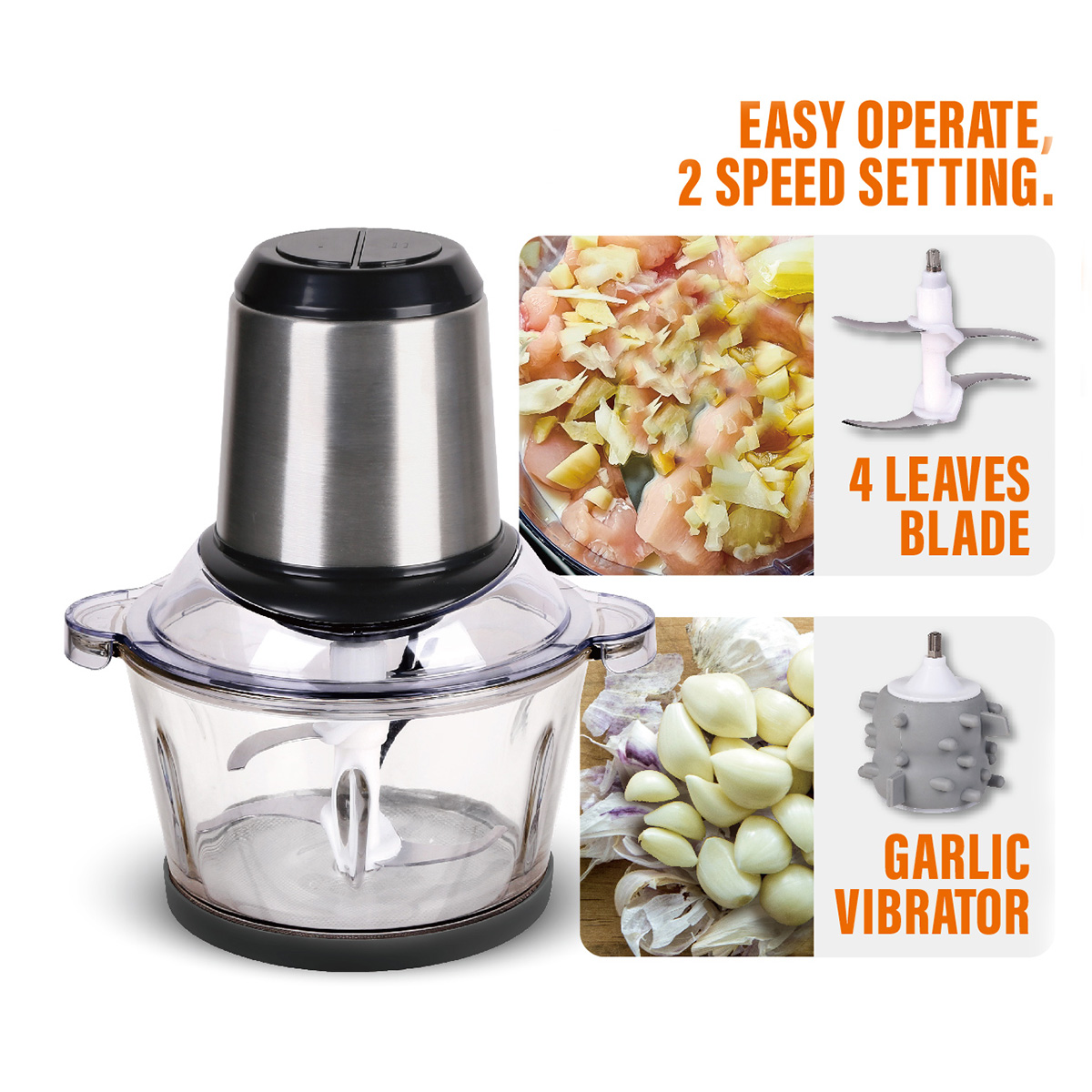 - Accessories : 4 Leaves Stainless Steel Blade, Garlic Vibrator