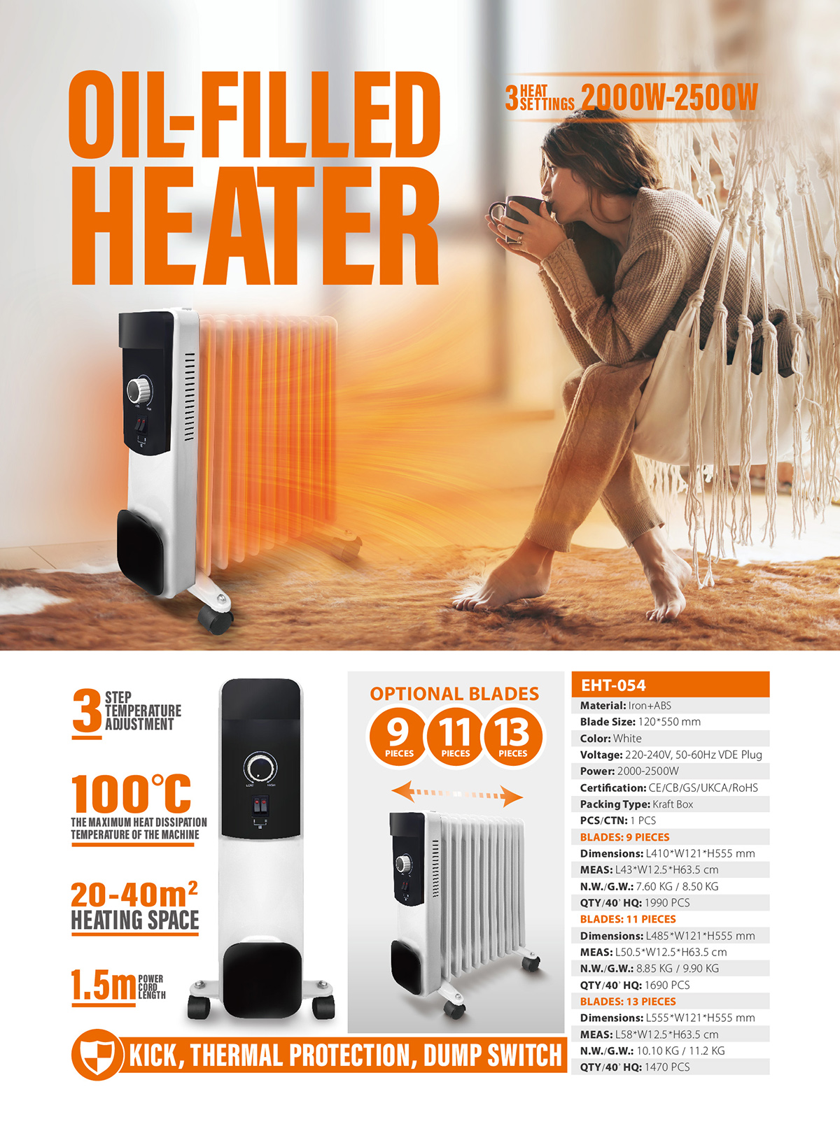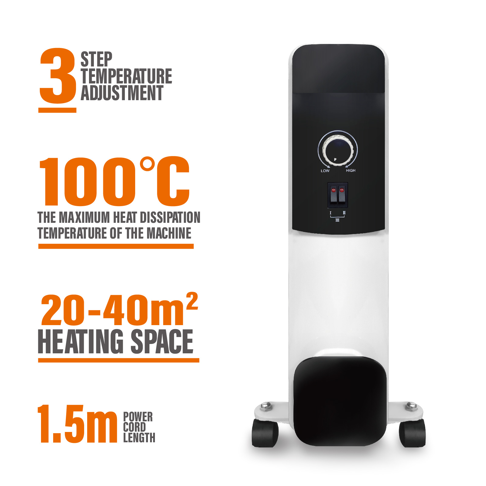 EHT-0543-step temperature adjustment. The maximum heat dissipation temperature of the machine is about 100°C. Kick, thermal protection, dump switch. Power cord length 1.5M. Heating space: 20-40m²